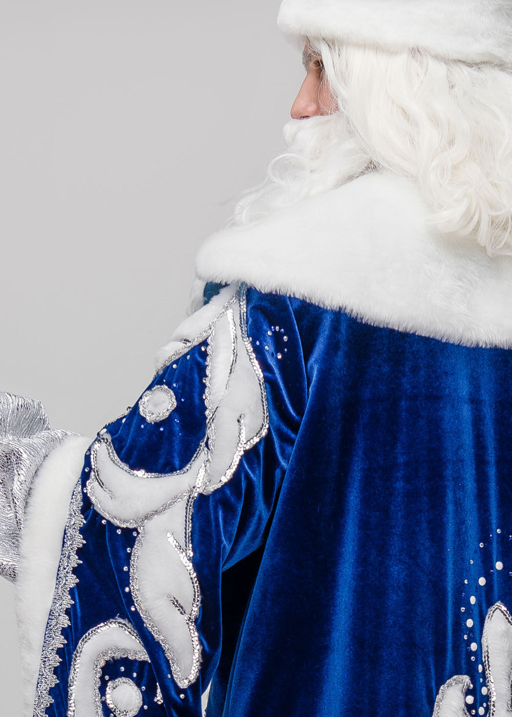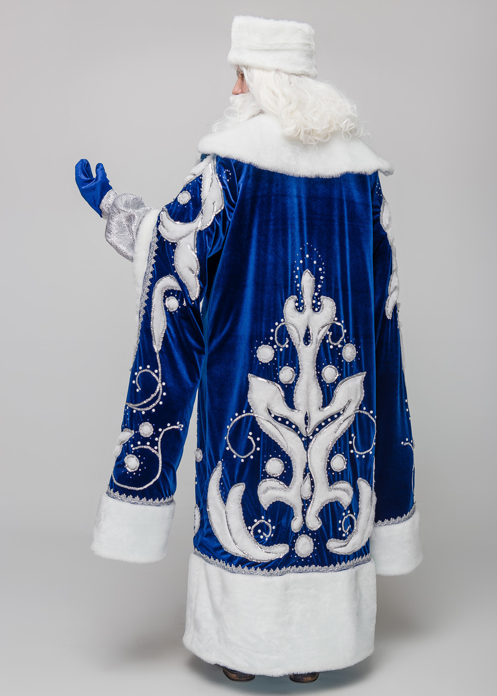 Почувствуйте себя настоящим зимним волшебником с костюмом Деда Мороза Княжский синий. Шуба, выполненная из синего велюра, украшена спереди и сзади рисунками, напоминающими фантастические узоры инея на оконном стекле. Яркость образу придает отделка из белоснежного меха мутон и декорирование серебристыми кристаллами, тесьмой и пайетками. Шуба застегивается на пришивные металлические кнопки, что обеспечивает надежную фиксацию и комфорт. Форму одеяния поддерживает стеганая подкладка, делающая костюм теплым и удобным для выступлений как на улице, так и в концертных залах. В комплект входит шуба, шапка, рукавицы и мешок. Для полного завершения образа можно отдельно приобрести парики и бороды, посохи и костюм Снегурочки.