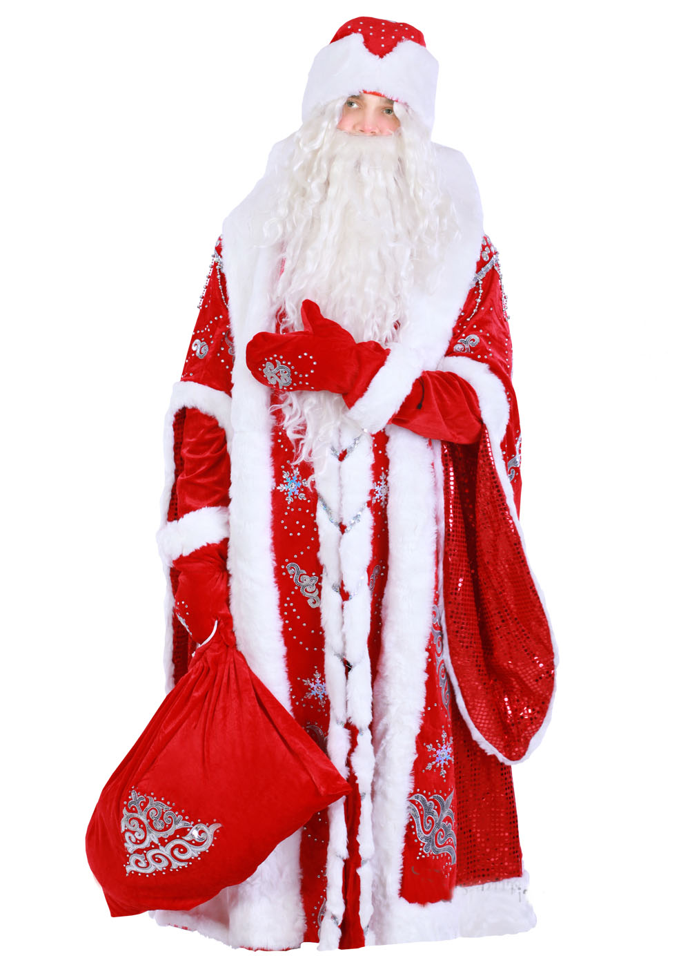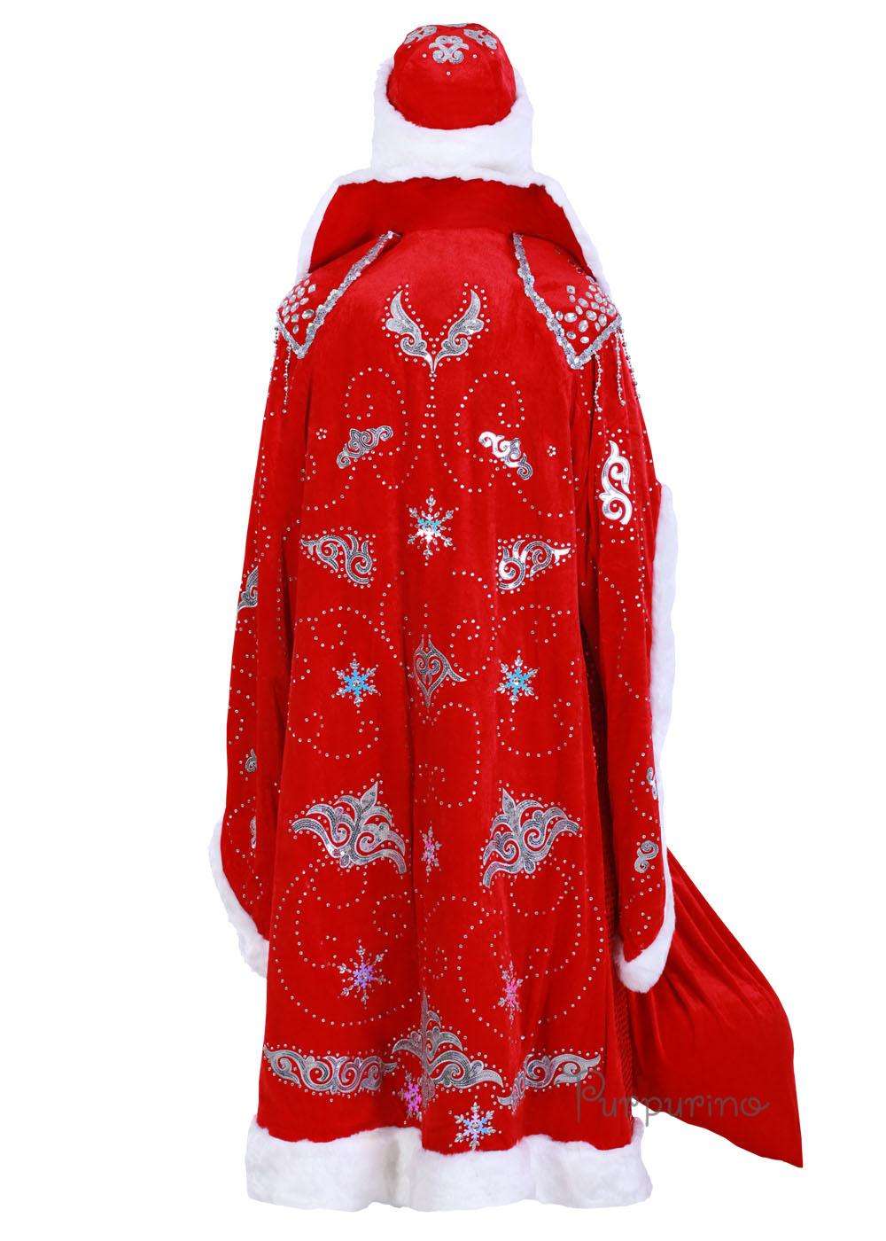 Костюм Деда Мороза Копейкин выполнен из роскошного красного бархата и украшен изящными серебристыми узорами. Шуба имеет богатую отделку белоснежным искусственным мехом, который придает наряду неповторимый вид. Шапка, рукавицы и мешок дополняют ансамбль, создавая полный образ Деда Мороза. Внутренняя подкладка сделана из стеганого утеплителя, что гарантирует тепло и комфорт в любой морозный день. Шуба застегивается на металлические кнопки, что обеспечивает удобство и практичность. Этот костюм идеален для выступлений на сцене, праздничных мероприятий и фотосессий. Завершите образ бородой, париком и посохом, которые можно приобрести отдельно, чтобы создать поистине волшебный облик.