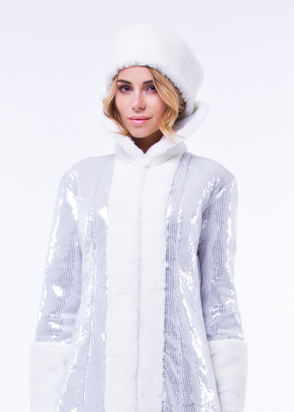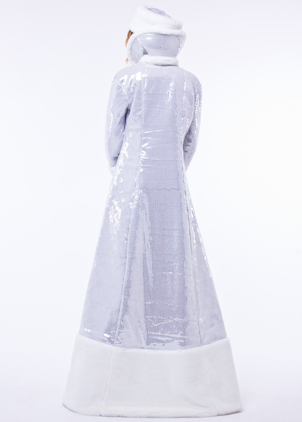Расшитый миллионами серебристых паеток костюм «Снежной Королевы» очаровывает своим изяществом и легкостью. Сказочная шубка на стеганой подкладке не потеряет форму, материал не тянется, не мнется. Гордую осанку подчеркивает декор из блестящего меха мутон. Яркие лучи гирлянд и прожекторов позволяют наряду переливаться всеми цветами радуги. Продуманный фасон убранства подойдет девушкам с любым телосложением. Аккуратные застежки не видны снаружи, шубка застегивается на кнопки, расположенные внутри. Аксессуары в продаже на сайте есть отдельно: унты, парики, болеро, карнавальные наряды Снегурочек.