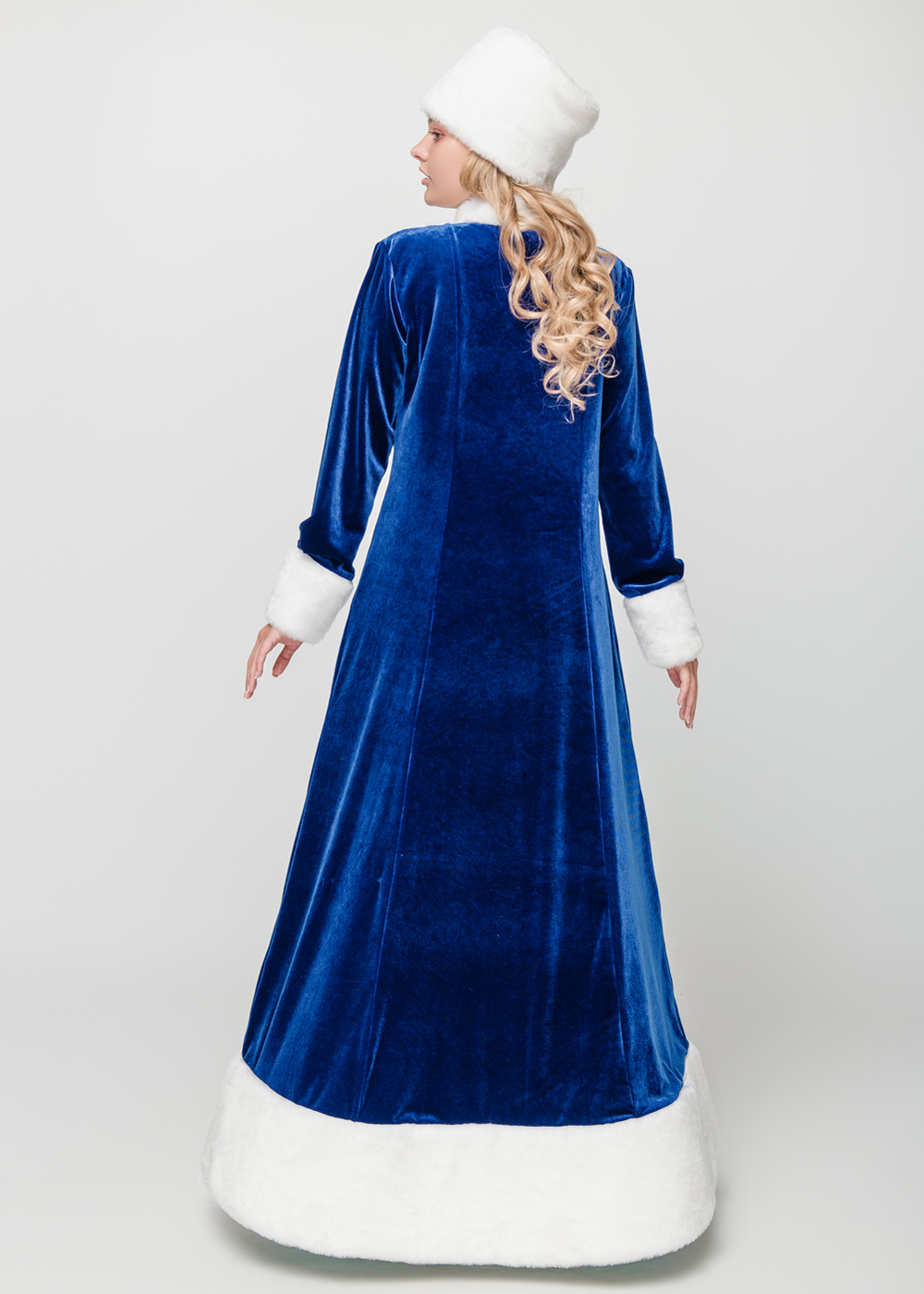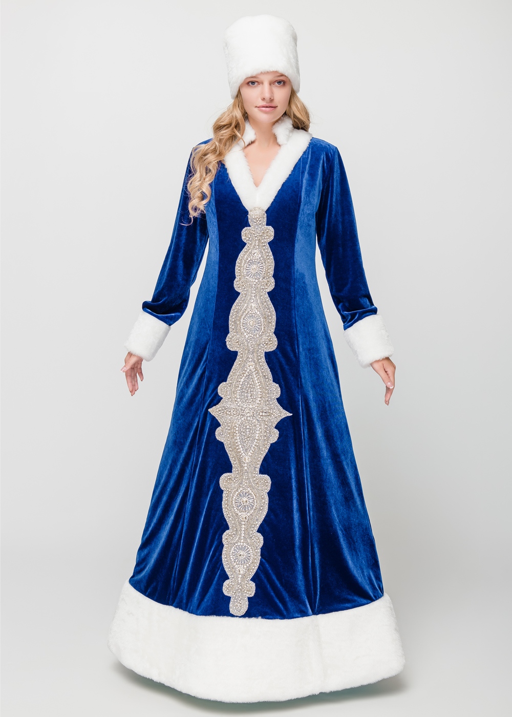 Этот наряд Снегурочки отличается изысканным дизайном, разработанным отечественными дизайнерами. Шубка из синего бархата с синтепоновой подкладкой подчеркивает стройность фигуры. Приталенная модель, расклешенная к низу, идеально подходит для девушек с различными типами фигуры. Богатый декор из стекляруса и серебряных нитей придает костюму особую элегантность. Шапка выполнена в едином стиле с шубкой, дополнена белым мехом мутон.