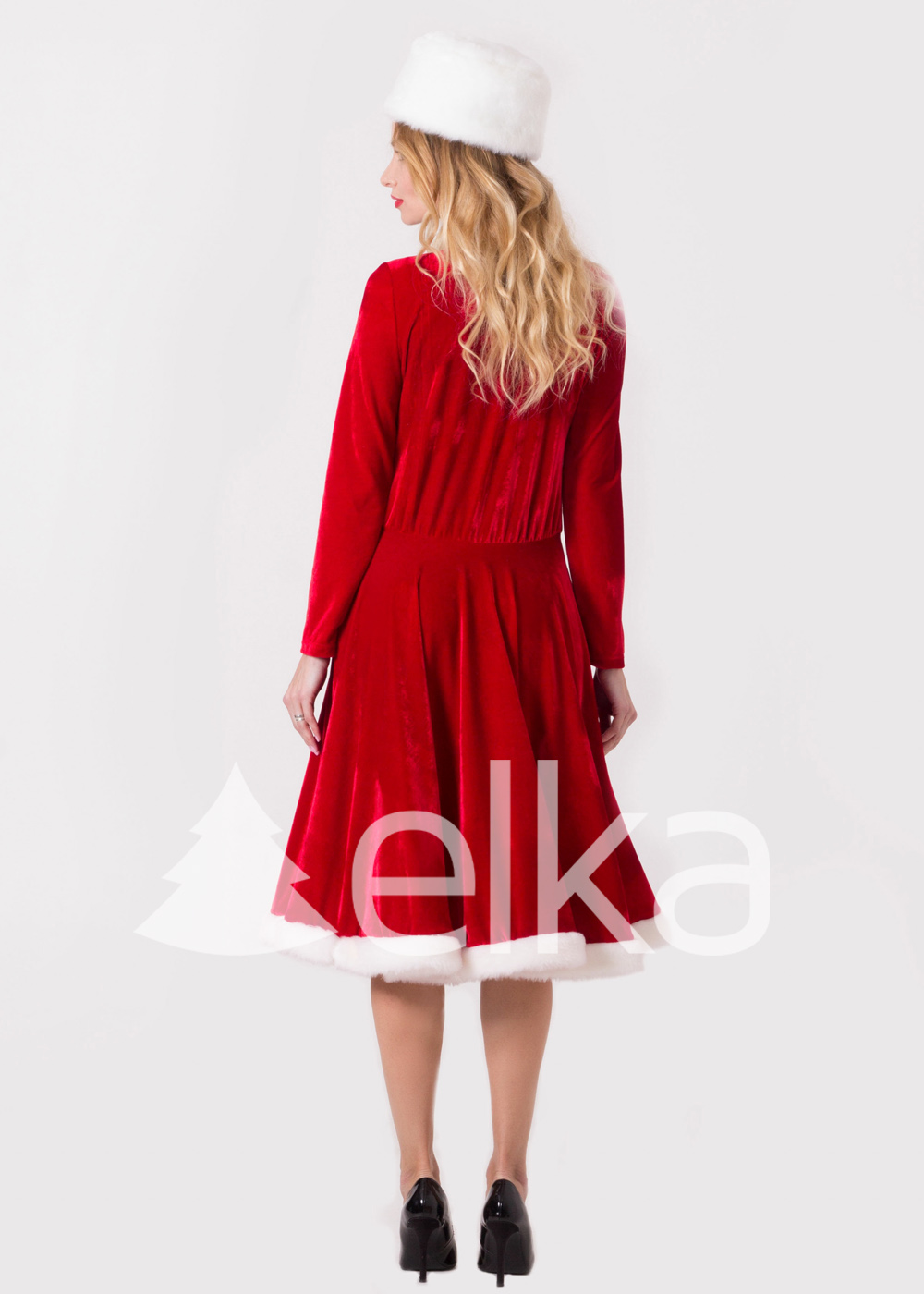 Новогоднее платье Снегурочки Суздальская красная пошито из натурального велюра. Материал красиво облегает силуэт. Расклешенная к низу юбка выглядит весело и игриво. Декольте платья и завышенный пояс украшены крупным новогодним орнаментом из страз, паеток и стекляруса. Длинный рукав и подол декорированы искусственным мехом. Мех блестит и переливается, придавая образу особенную мягкость и загадочность. Платье Снегурочки подходит для профессиональных и домашних выступлений.