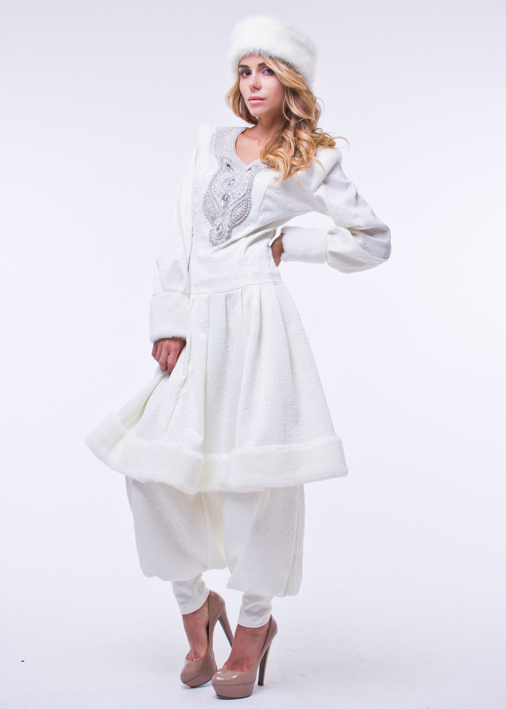 Поможет перевоплотиться в сказочного персонажа Снегурочку, новогодний костюм Боярыня. Необычный, стильный дизайн костюма подойдет девушкам с любой фигурой. Суженный по талии, костюм расходится на бедрах и ниспадает к низу. Костюм отлично держит форму благодаря стеганой подкладке. Яркая парча расшита замысловатыми узорами. Воротник, передняя планка и рукава декорированы искусственным мехом белого цвета. Богатое убранство завершает шапочка с меховой оторочкой. Праздничный наряд не потеряет своей привлекательности и прослужит не один год, мех долго остается блестящим и белоснежным. Костюм Снегурочка Боярыня подойдет для детского утренника и корпоративной вечеринки. Стильная и модная Снегурочка покорит гостей праздника своей красотой и грациозностью.