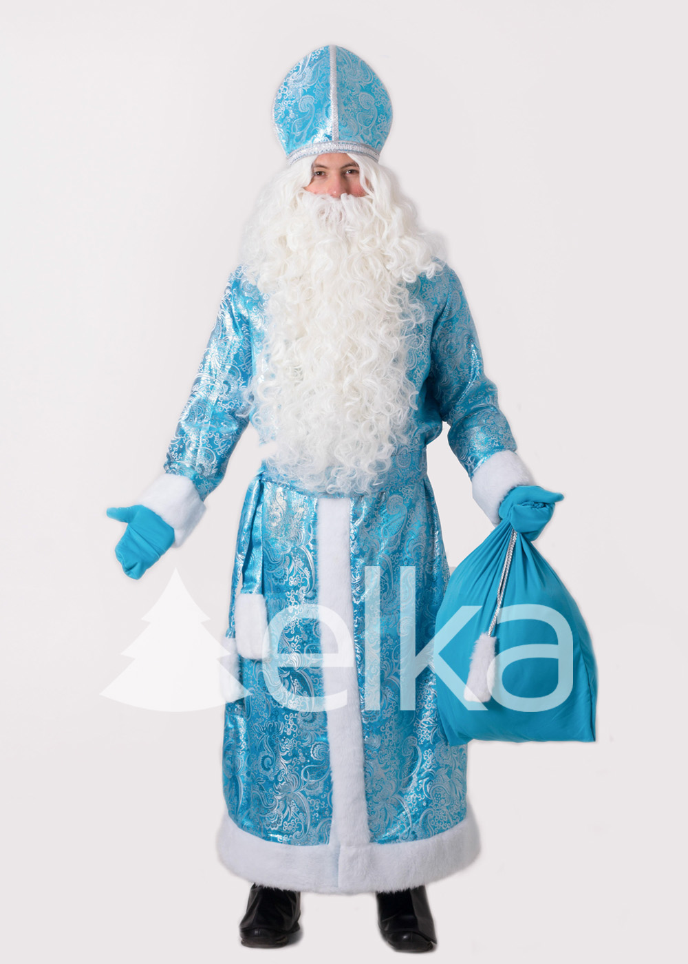 Костюм Святого Николая голубой, украшенный серебряными узорами, создает изысканный образ мужественности и благородства. Этот мужской наряд прекрасно подходит для создания неповторимой атмосферы праздника.