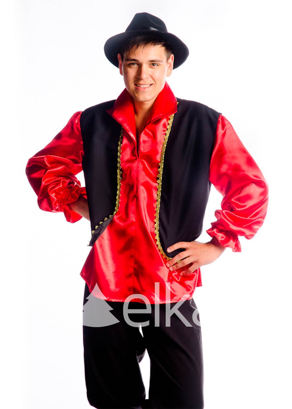 Костюм Цыгана представлен в классических тонах - красном и чёрном. В комплекте: рубашка с жилетом, имитация обуви и шляпа. Красная рубашка свободного кроя с длинными рукавами, собранными резинкой на запястье, имеет небольшой отложной воротник и дополнена черным жилетом, отороченным золотой тесьмой. Имитация обуви и черная шляпа сделают образ Цыгана узнаваемым.