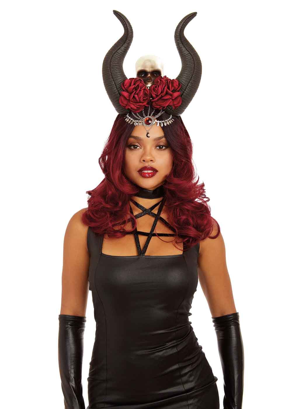 Жіночий головний убір з рогом та черепом - зухвалий та стильний аксесуар, який додасть загадковості та індивідуальності вашому образу. Пов'язка на голову прикрашена рогами та черепом, створюючи містичну атмосферу. Штучні червоні квіти надають пов'язці жіночності та загадковості.