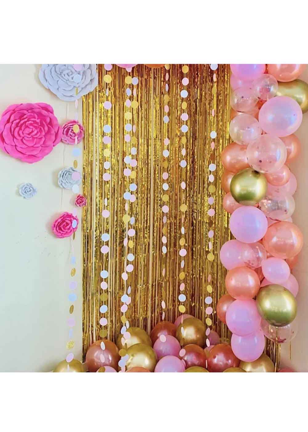 Банер блискучі стрічки є красива прикраса для будь-якого свята або заходу. Розмір складає 1*2 метри. Банер містить фольговані фіранки трьох кольорів: сріблястого, рожевого та золотого, які прикрашені блискітками, надаючи вашому заходу шик та елегантність.