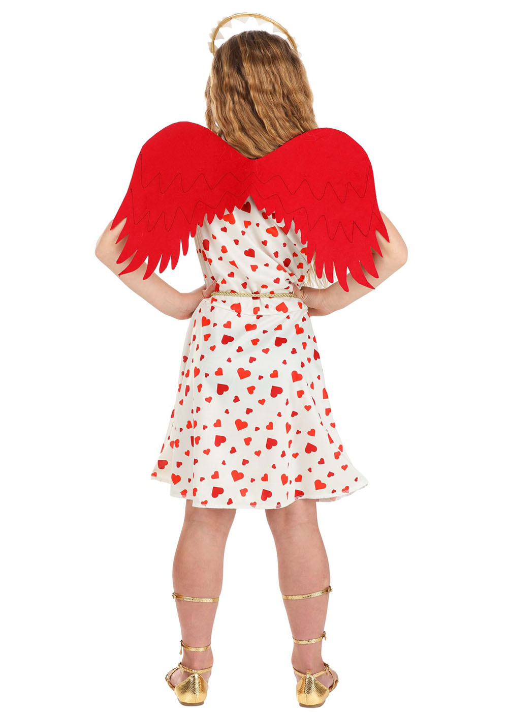 Дитячий костюм Купідона виконаний із трикотажної тканини. Сукня з одним плечем на резинці з еластичним поясом. Ви можете зав'язати золотий мотузковий пояс, як вам зручно. Крила з вельвету мають еластичні лямки на плечах. Обідок, покритий тканиною, прикрашений аркою із блискучих сердець.