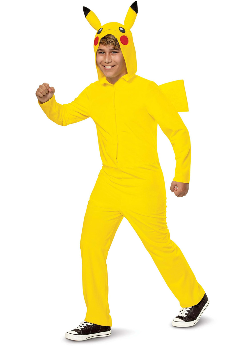 Костюм Пікачу для хлопчика виконаний з м'якого велюру. Попереду на комбінезоні є липучки. На верхівці каптуру м'які скульптурні вушка. Хвіст пришитий на спину комбінезону.