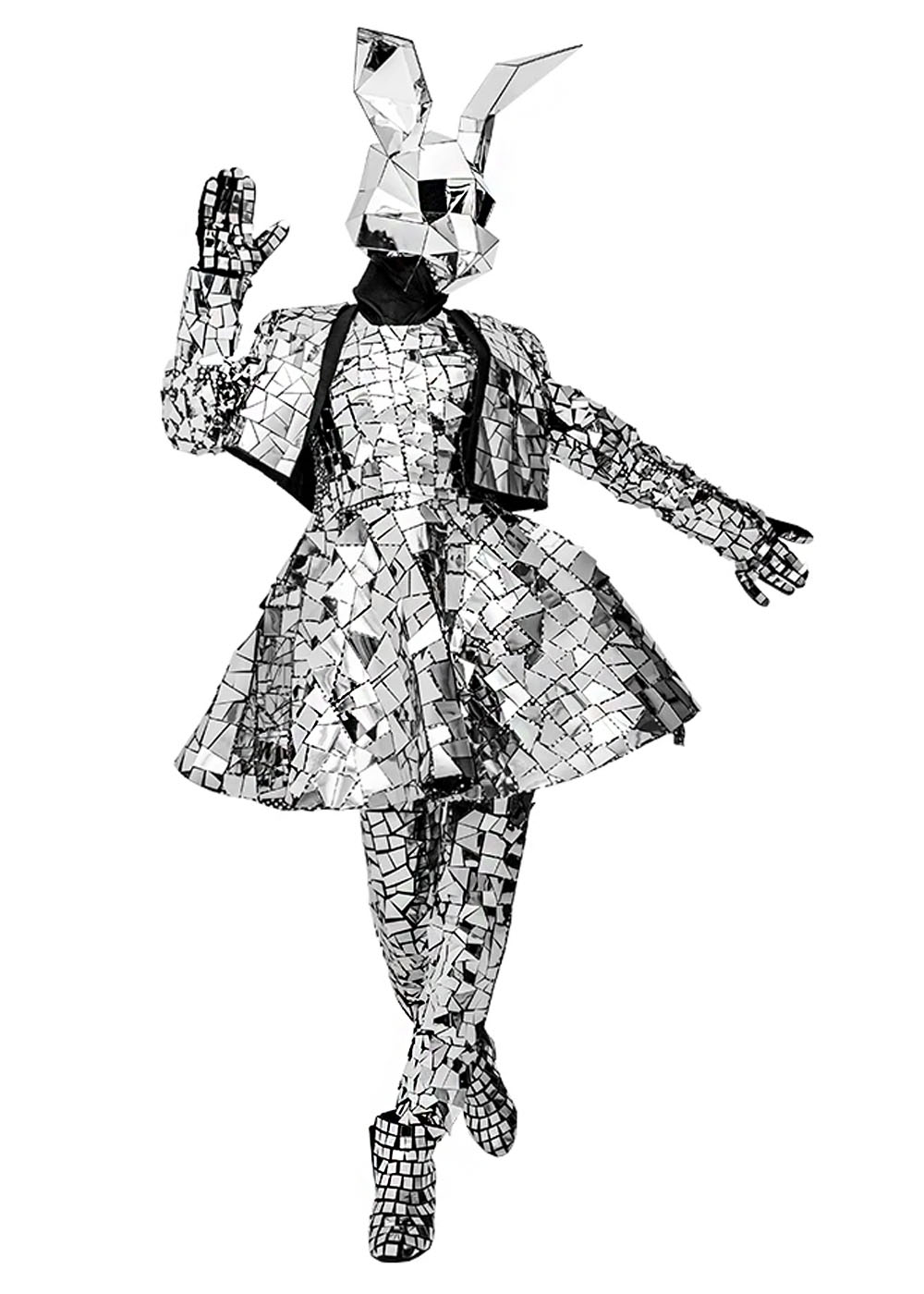 Дзеркальний костюм Зайчика додасть вашому образу грайливості та загадковості! У комплект входять піджак, сукня, штани, рукавички, взуття та головний убір. Виготовлений з особливого дзеркального матеріалу, цей костюм створює ефект приголомшливого блиску та оригінальності.