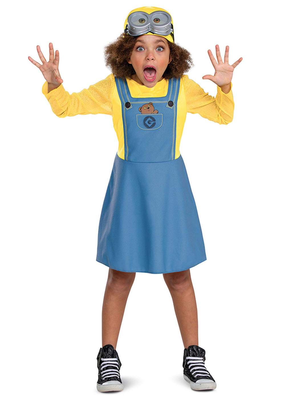 Костюм включає сукню, стилізовану під м'який флісовий комбінезон над жовтою атласною сорочкою з сітчастими рукавами. Застібка на липучці у центрі спини, еластичний пояс на спині. Жовта шапка з атласу з піною на задньому боці. Великі окуляри мають регульовану еластичну стрічку навколо задньої частини голови.