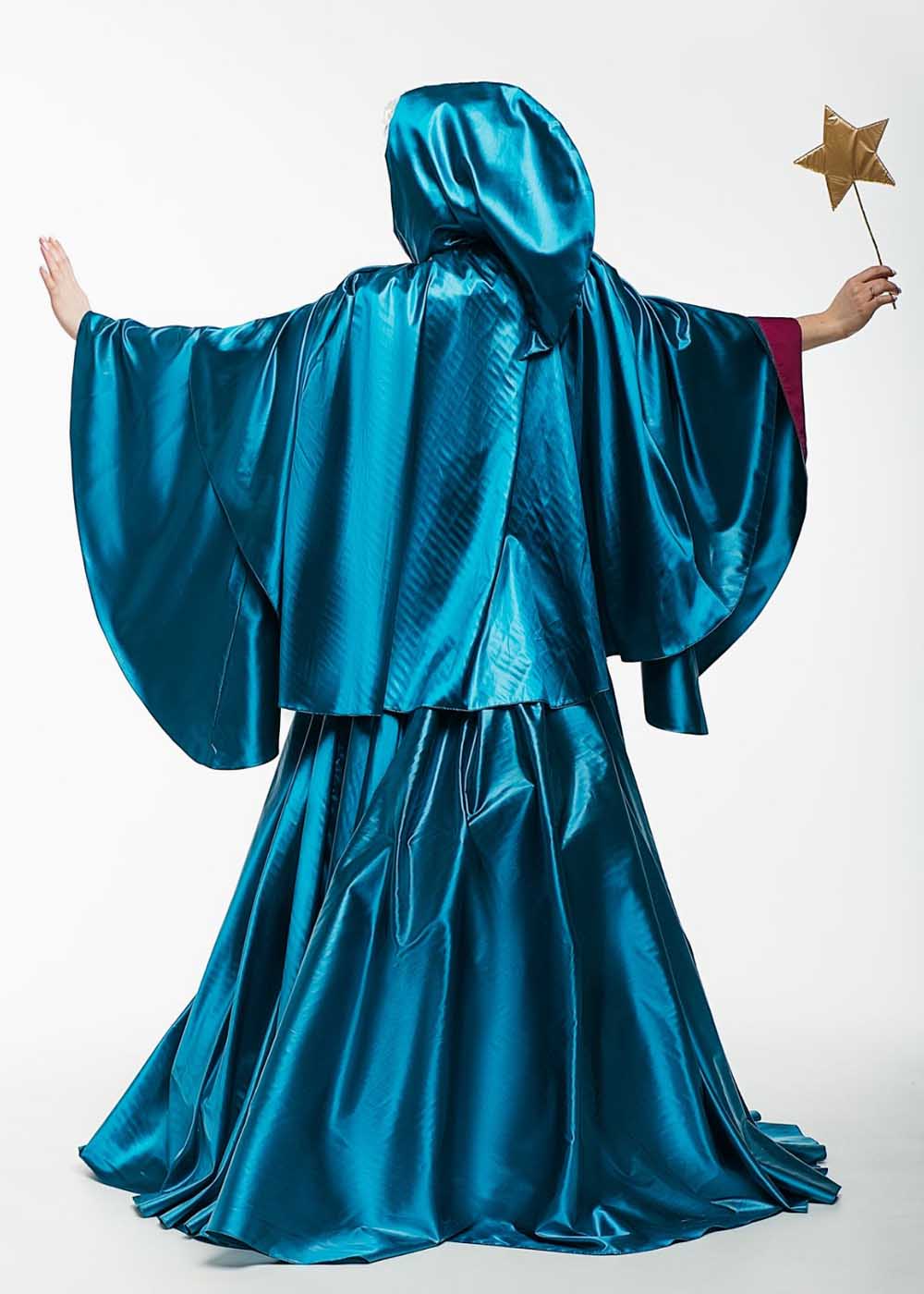 Виконаний костюм із тафти та трикотажу. Складається костюм з блузи, спідниці та накидки. Пишна спідниця із тафти гарно переливається. Рукави блузи розкльошені, що надає образу легкості, в рукавах і капюшоні є фіолетовий підклад. Прикрашає образ великий бант на горловині.