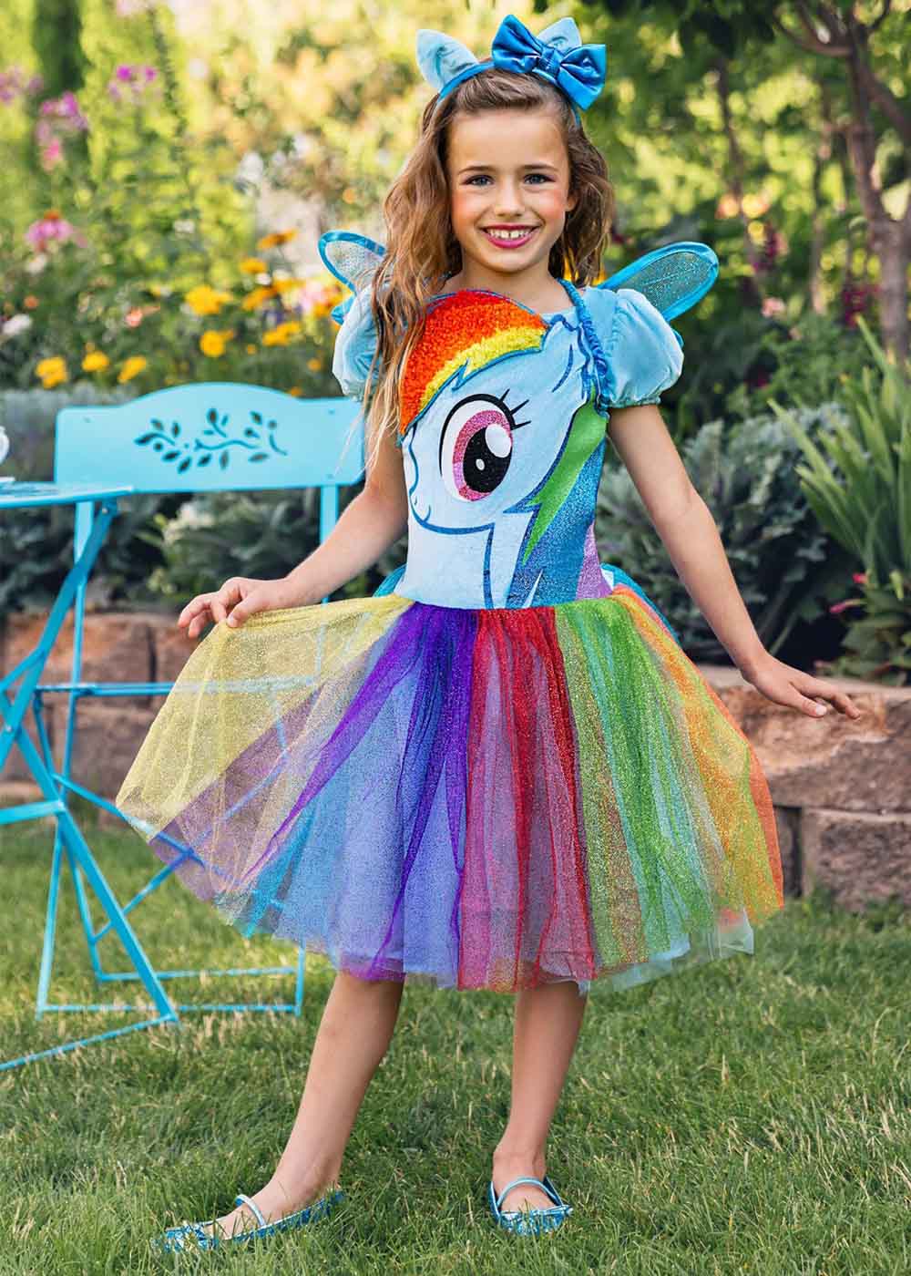 Чарівний костюм Рейнбоу Деш перетворить вашу маленьку модницю на справжнього райдужного поні! Верх сукні з велюру та яскравими графічними малюнками створює враження пухнастої вовни, тоді як нижня частина з багатошарової спідницею фатинової усипана блискітками, надаючи образу магічний блиск. Сяючий хвіст кріпиться до спини сукні за допомогою липучки, а крила з еластичними лямками на плечах забезпечать комфортне носіння. Головний обідок, прикрашений атласним бантом та велюровими вушками, завершує образ неповторного поні.