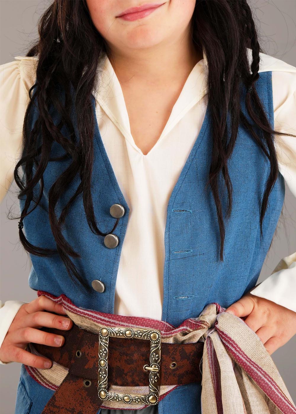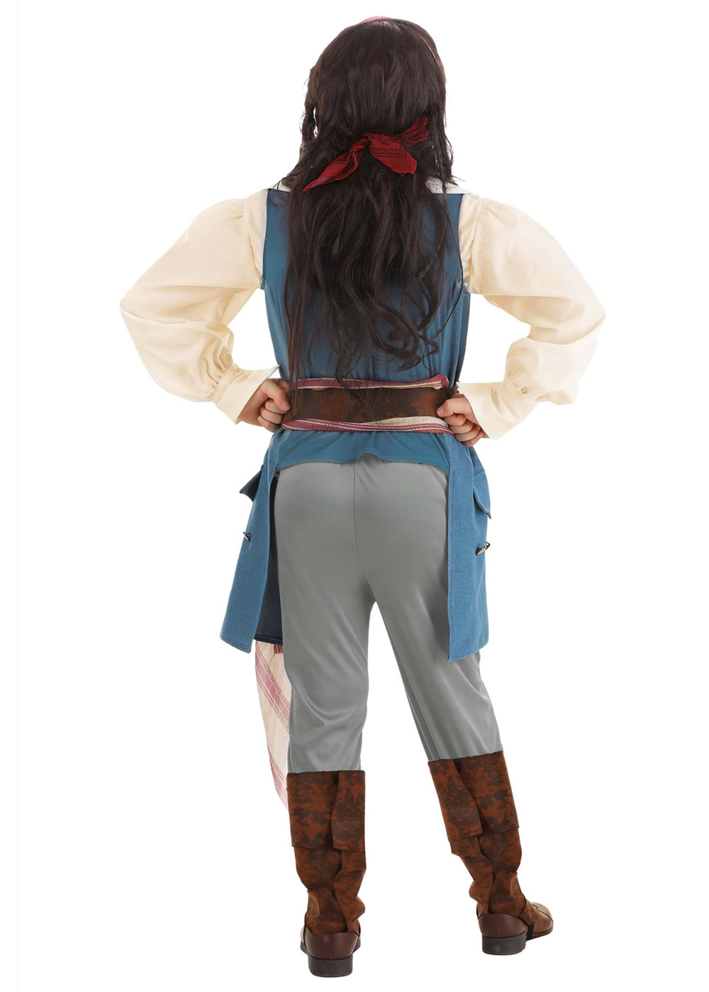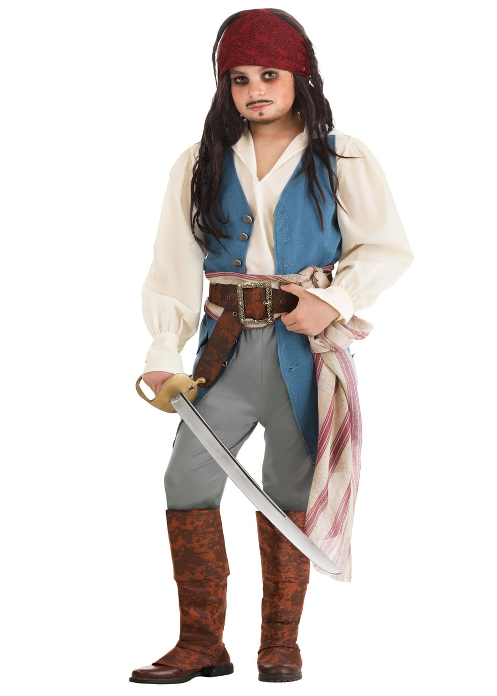 Перетворіть вашого хлопчика на Джека Горобця з цим костюмом! Сорочка з бавовни, жилет та штани з поліестеру створять стильний образ. Жилет у тонкі смуги із застібкою на гудзику по центру спереду. Сірі штани з еластичною талією та манжетами. Червона хустка зав'язується навколо голови. Накладки на взуття фіксуються на резинках.