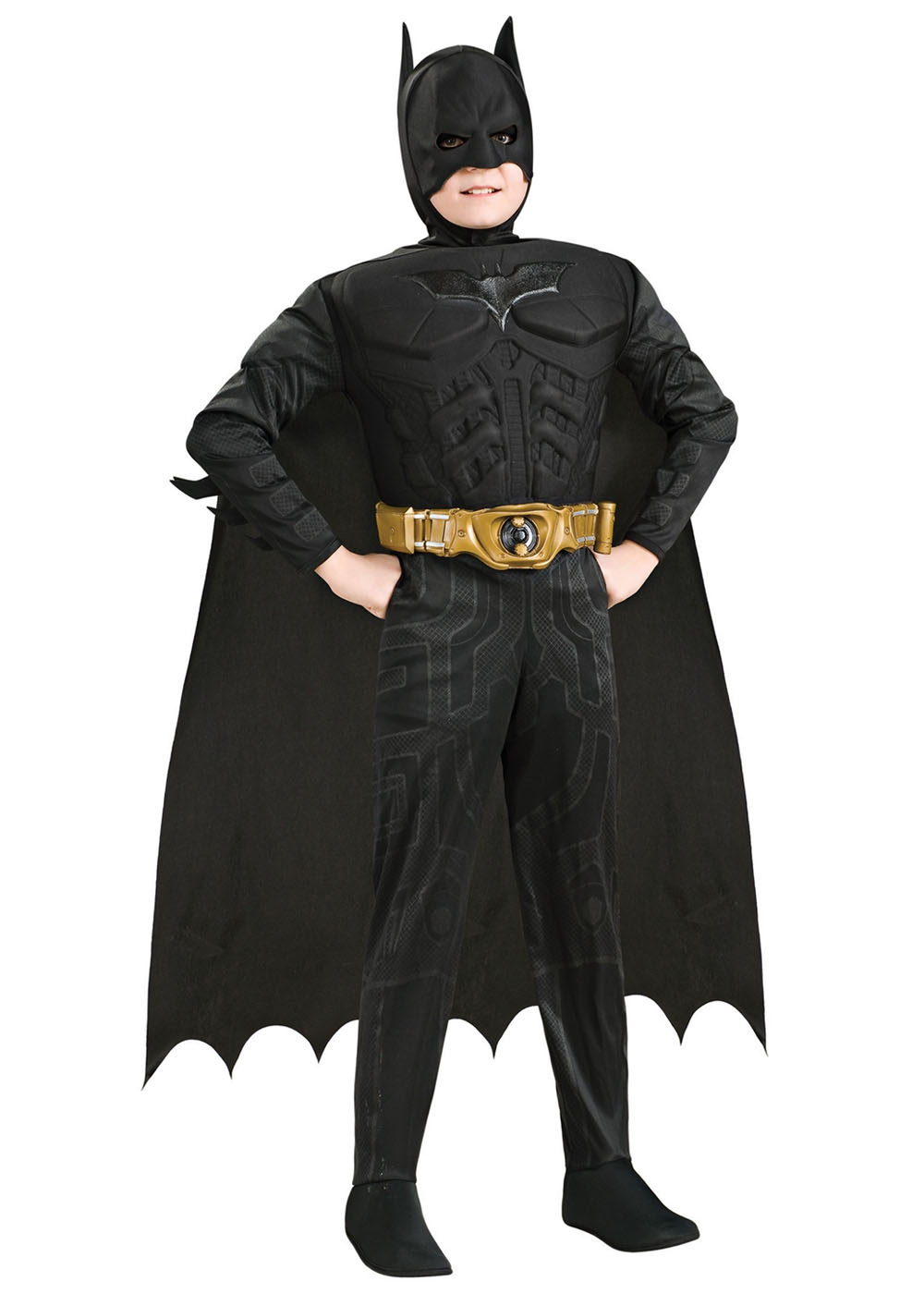 Дитячий костюм Бетмена включає чорний комбінезон з нанесеними деталями, поліуретановий м'язистий корпус, латексний ремінь спорядження, маску Бетмена та плащ.