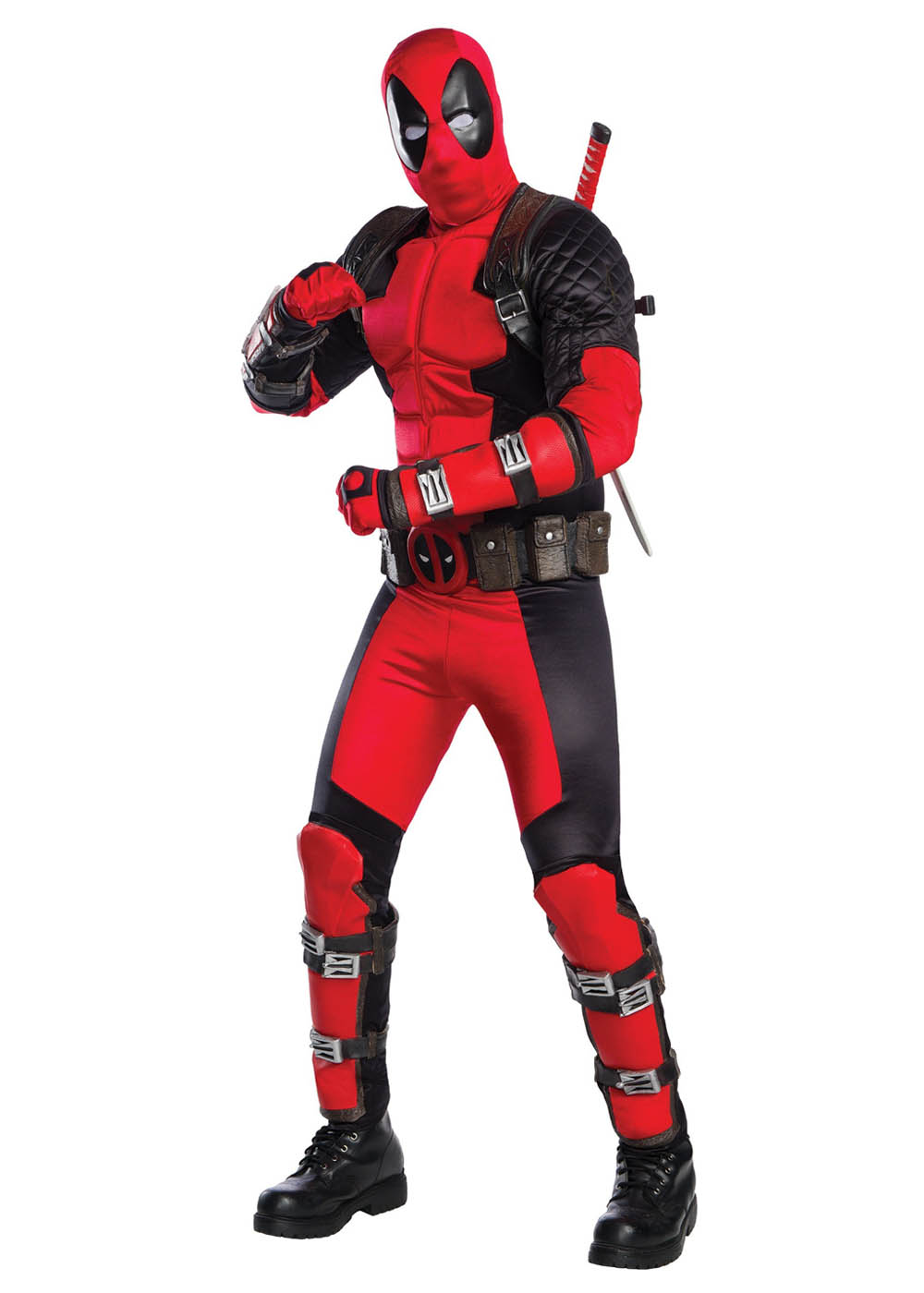 Костюм Дедпула авторського дизайну включає комбінезон із ущільненими грудьми та руками, прикрашеними швами, застібка-блискавка ззаду. Рукавички з еластичного матеріалу із простроченими деталями, довжина до зап'ястя. Маска з еластичного матеріалу покриває всю голову, на спині застібка-блискавка для зручності. Латексний пояс із пінним наповнювачем для форми, застібка-липучка ззаду. Утримувач зброї з литого пластику з прикріпленими ременями на руки, зброя закріплюється. Накладки на плечі з литого латексу ковзають по ременях на руках для розташування на плечах.