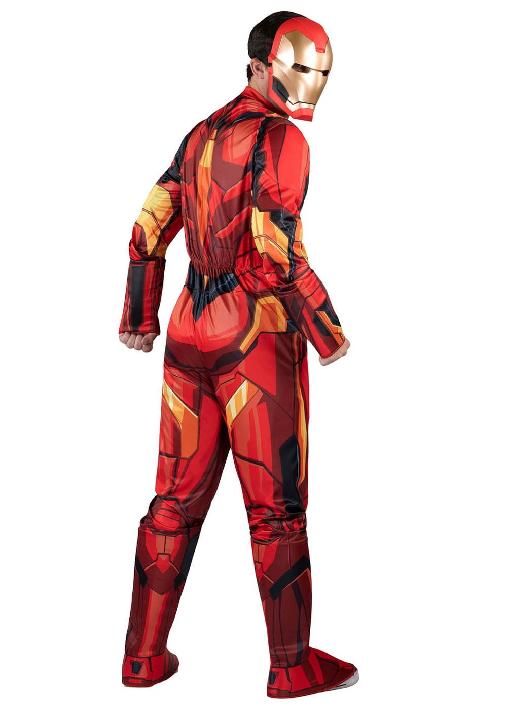 Костюм для дорослої Залізної Людини включає комбінезон із застібкою-липучкою в центрі спини. М'які підкладки із синтетичного наповнювача в області грудей та плечей надають м'язистого вигляду. Прикріплені накладки на взуття мають пінний наповнювач та еластичні стрічки підошви. Лита пластикова маска покриває все обличчя і має еластичну гумку навколо голови.