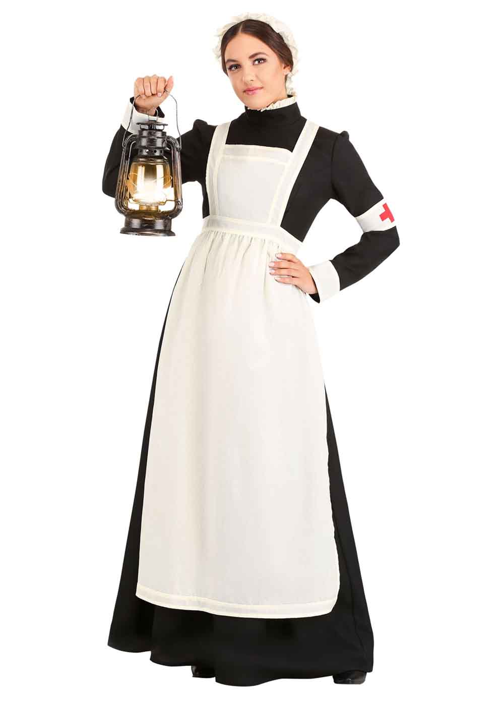 Карнавальний костюм медсестри включає сукню з блискавкою на спині та корсетним верхом. Комір та манжети рукавів надають яскравого акценту. Шапочка з еластичною кромкою навколо голови.