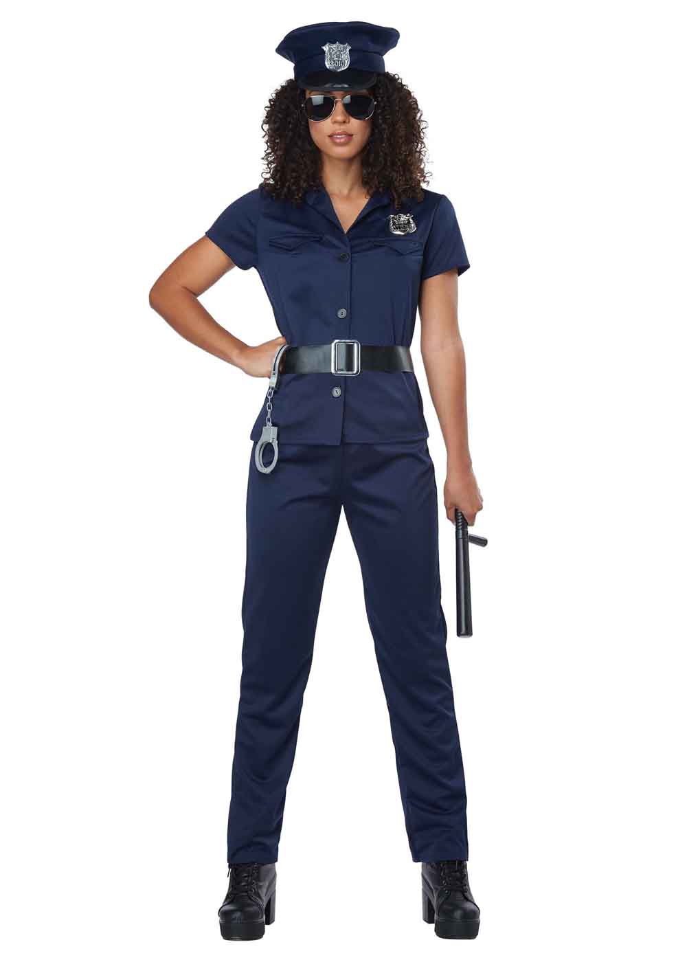 Жіночий костюм поліцейського включає регульований пояс, значки на кліпсах, кепку з еластичною гумкою для зручного регулювання та сорочку із застібкою на гудзики спереду. На сорочці також є дві накладні кишені, а штани оснащені еластичним поясом.