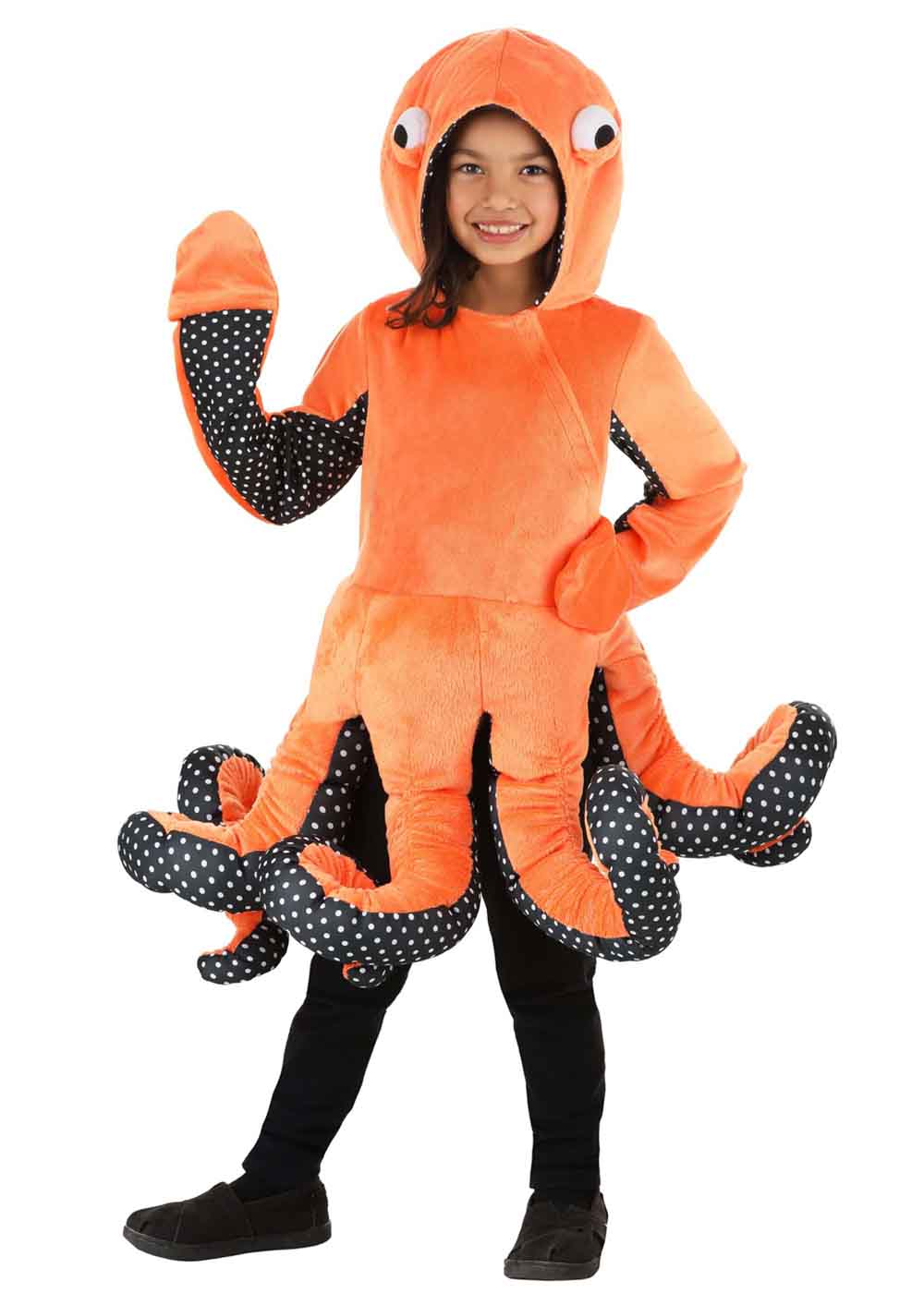 Восьминіг костюм - втілення веселощів та оригінальності. Помаранчева туніка із застібкою липучкою спереду зручна та яскрава. Рукави, підкладка капюшона та щупальця прикрашені веселими горошинами. Рукавиці на рукавах можна відкинути, щоб звільнити руки. Капюшон із наповнювачем має очі, вишиті чорною ниткою. Щупальці, заповнені наповнювачем, виглядають закрученими, додаючи костюму реалістичний вигляд.