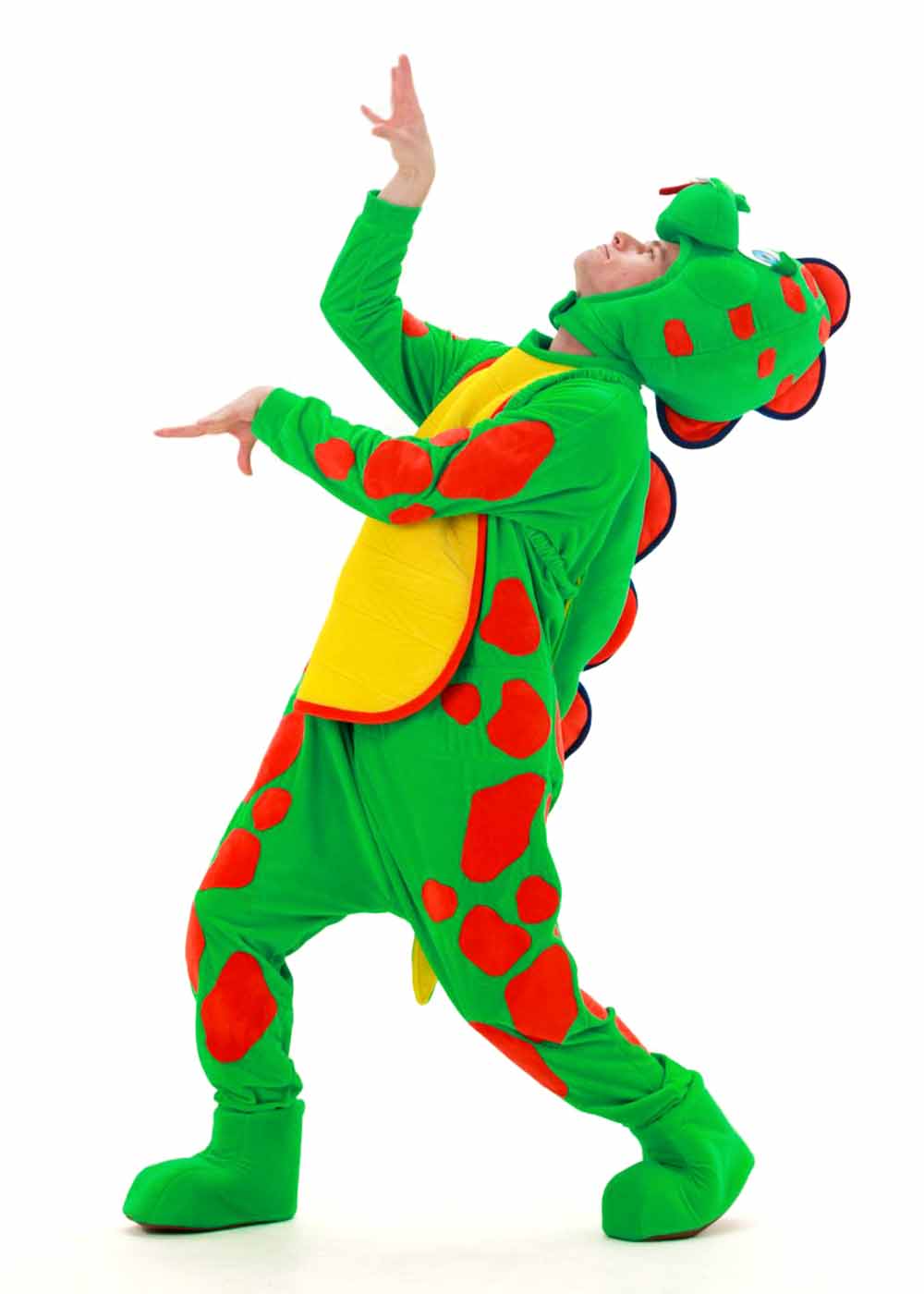 Карнавальний костюм Динозаврик Тоша продовжує колекцію "Костюми для аніматорів". Виконаний з високоякісних матеріалів: вельбо та велюр, цей костюм забезпечує комфорт і довговічність. Пропонується у розмірі M-L. Комбінезон з довгим рукавом пошитий у зеленому кольорі, з жовтим животиком та декорований червоними плямами. Хвіст Динозаврика має лямки та одягається як рюкзак. Головний убір та взуття доповнюють комплект. Цей костюм ідеально підходить для анімаційних програм, костюмованих вечірок та дитячих заходів, привертаючи увагу та викликаючи захоплення у всіх учасників.