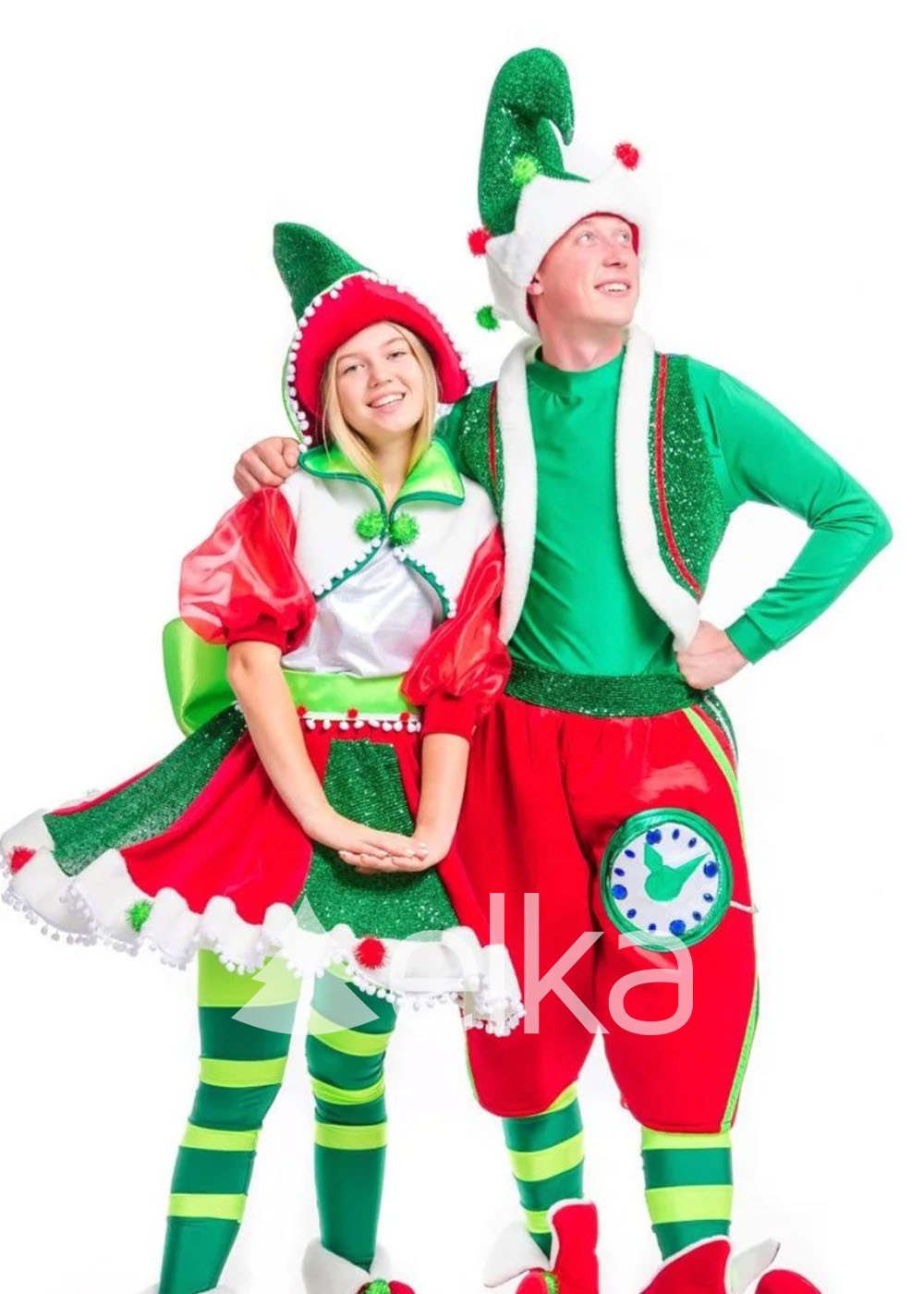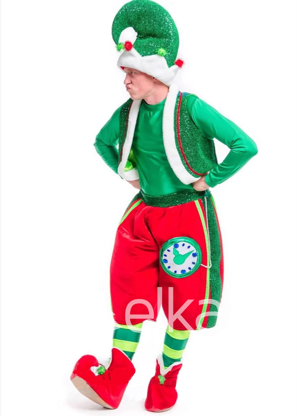 Костюм Ельфа чоловічий складається з: кофти, жилетки, штанів, ковпака, гетрів і взуття. У вбранні використовуються такі тканини: трикотаж, атлас, штучне хутро. Зелена атласна кофта з довгим рукавом декорована блискучим жилетом, що прикрашений штучним хутром і червоною тасьмою. Широкі штани червоного кольору з лампасами темного та світлого відтінків зеленого кольору з ілюстрацією годинника. Головний убір декорований пухнастими помпонами. Смугасті гетри та взуття доповнюють і завершують образ.