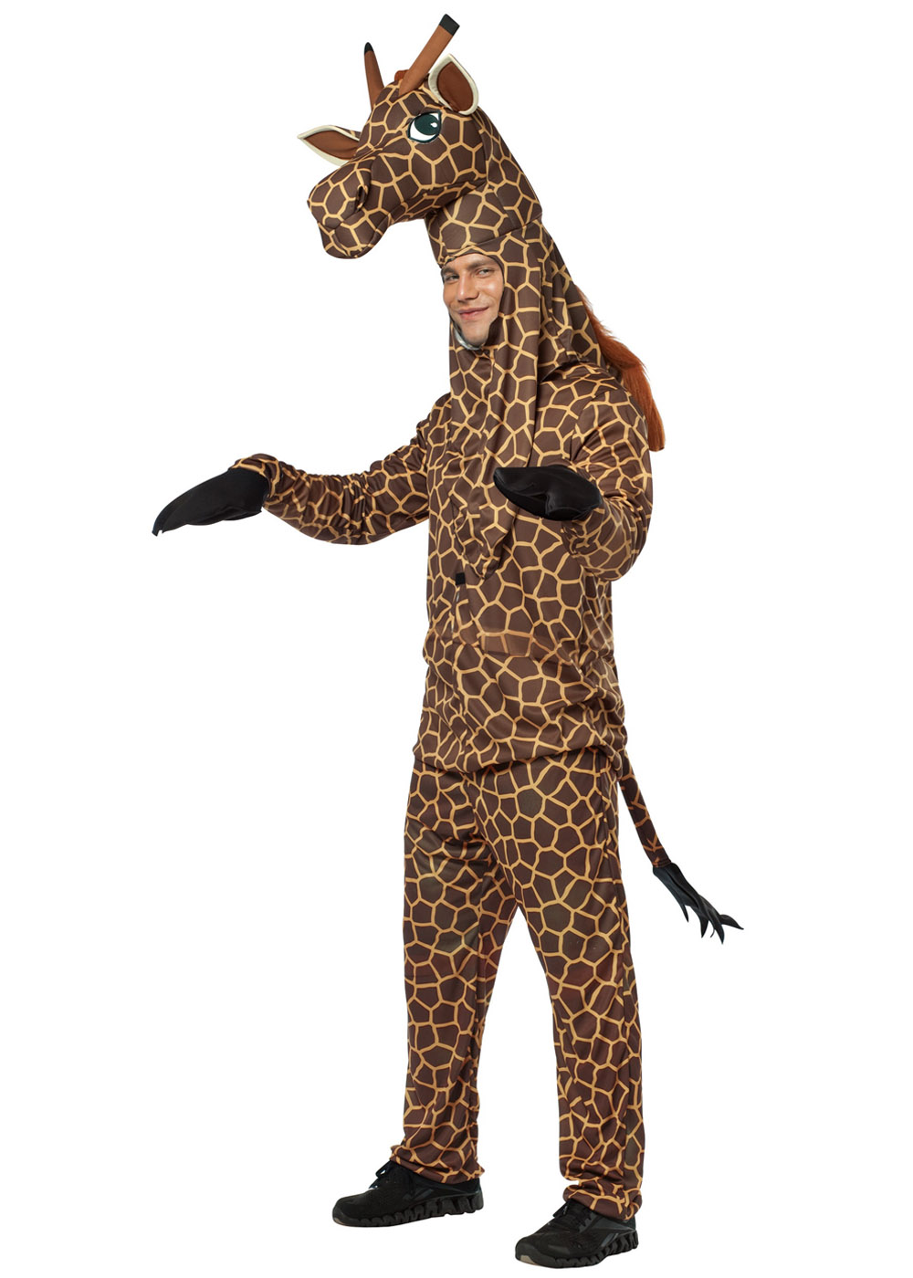 Костюм жирафа включає кофту з принтом. Хвіст пришитий до нижньої частини сорочки. Також у комплекті є штани з таким же принтом. Головний убір у формі голови жирафа кріпиться до кофти за допомогою липучки.