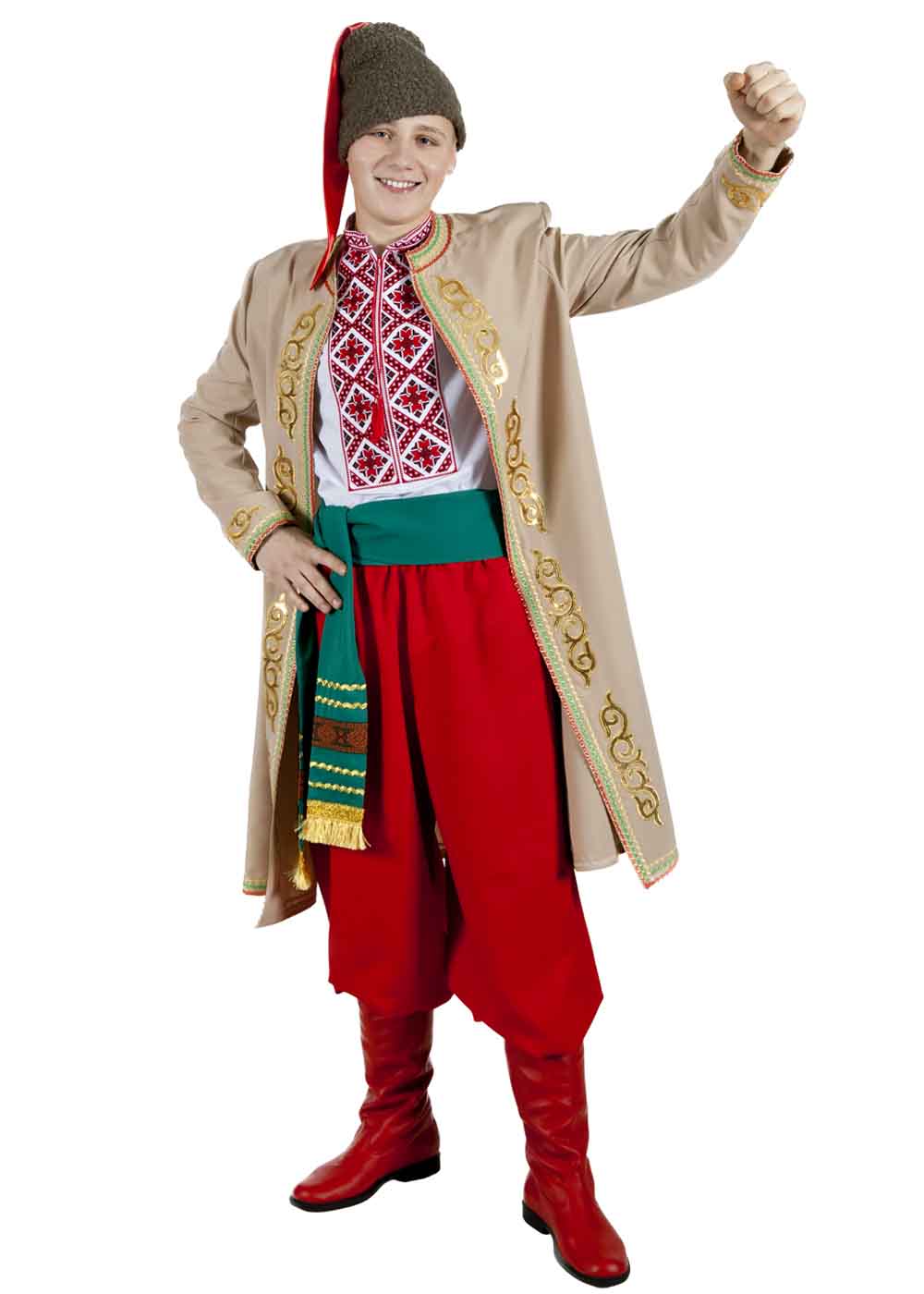 Український народний костюм "Грозан" передає дух і традиції козацької епохи. Вишиванка вільного крою прикрашена вишивкою в червоно-чорних тонах, а манжети застібаються на ґудзик. Свита декорована аплікацією золотого кольору і має відрізну спинку, що надає їй особливого шарму. Шаровари з червоного габардину ідеально доповнюють образ. Пояс і головний убір завершують комплектацію, додаючи автентичності. Сценічні народні чоботи можна придбати додатково. Костюм шиється на замовлення за індивідуальними мірками, що гарантує ідеальну посадку та комфорт.