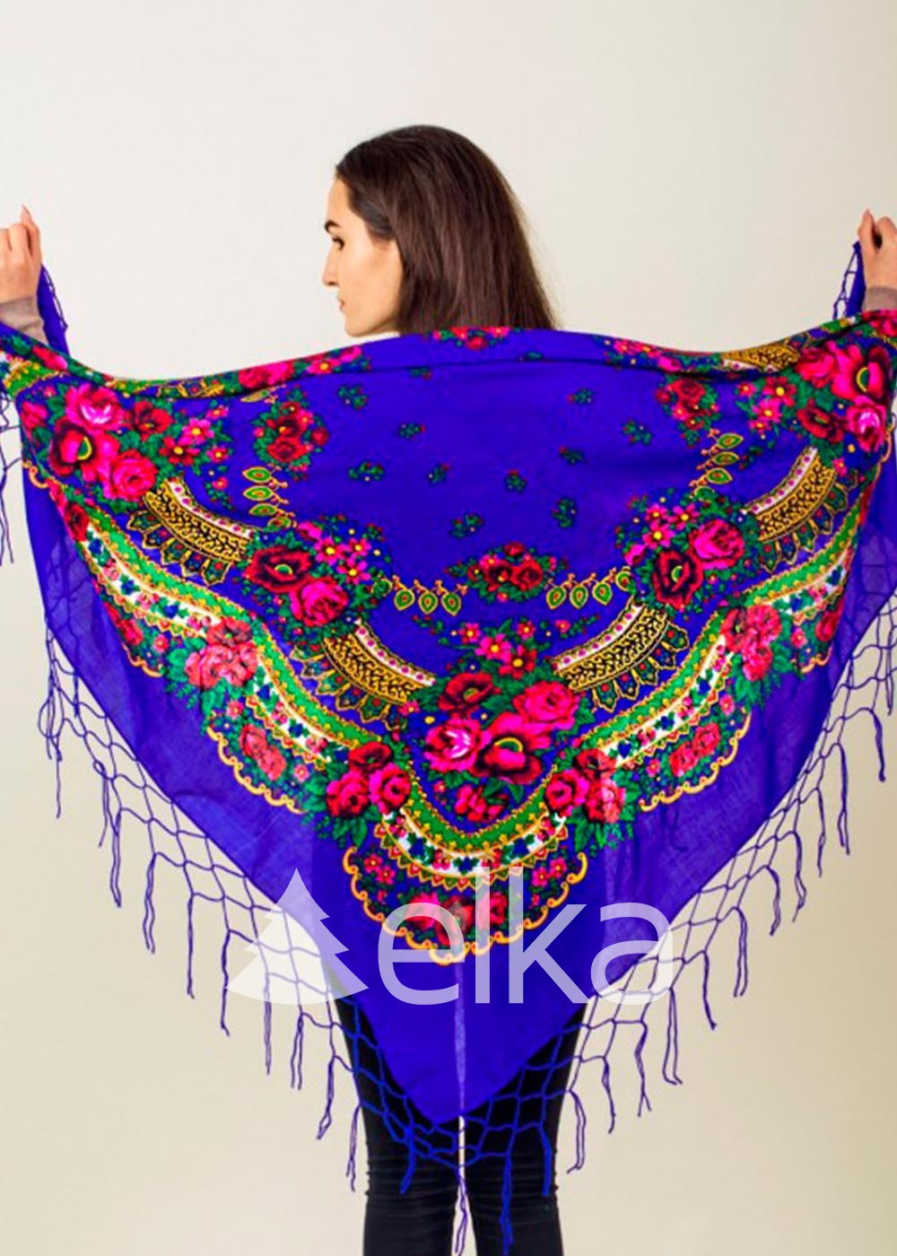 Розмір хустки 125 см * 125 см. Хустка синього кольору пропонується в єдиному розмірі. Жіноча національна хустка виконана з якісної яскраво-синьої акрилової тканини. Народна хустка для жінок прикрашена національним орнаментом та ажурним плетінням по всьому периметру виробу.