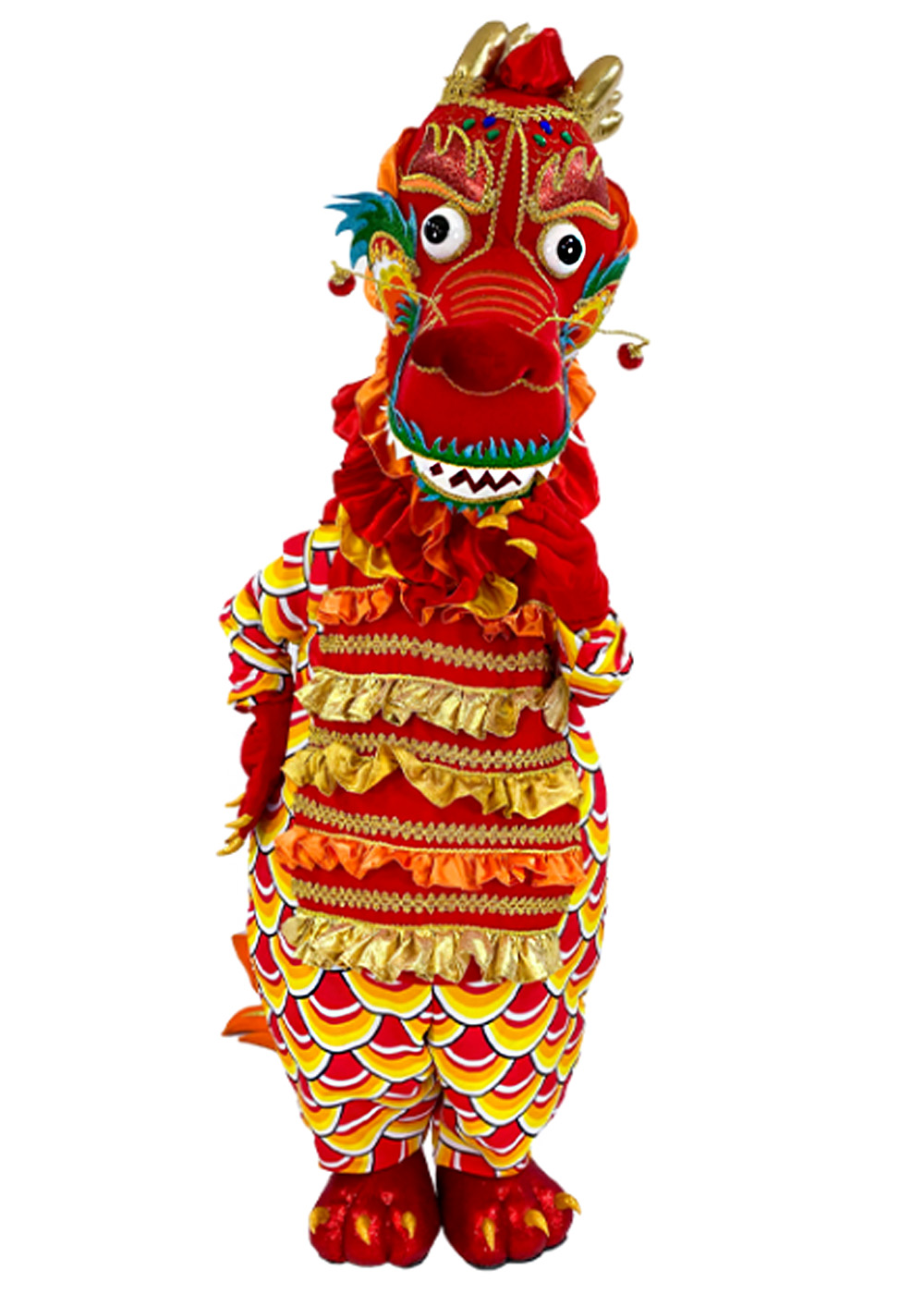 Ростова лялька Китайський Дракон у яскраво-червоному кольорі привертає увагу своїм чудовим виглядом. Голова з поролоновим каркасом, обтягнутим хутром, має сітчасті очі, оглядову ділянку та додаткові вентиляційні отвори у роті для комфорту. Тулуб також виконаний з поролонового каркаса, обтягнутого хутром з об'ємними декоративними елементами. У комплекті є пара рукавичок та пара взуття на поролоновому каркасі, обтягнутому тканиною, з поліуретановою підошвою, завершуючи образ цього вражаючого китайського дракона.