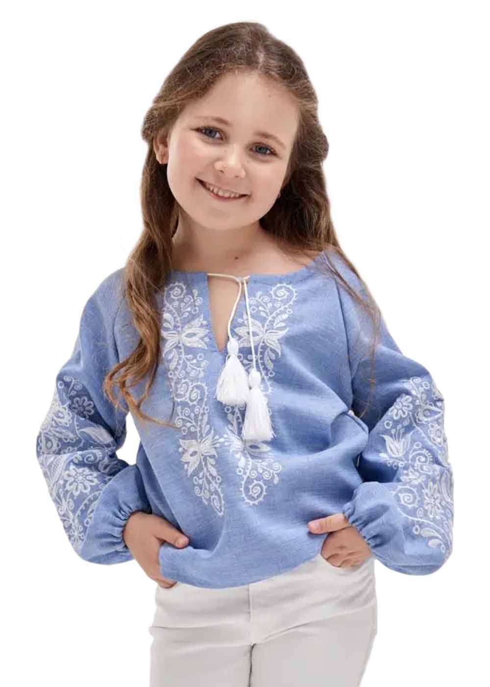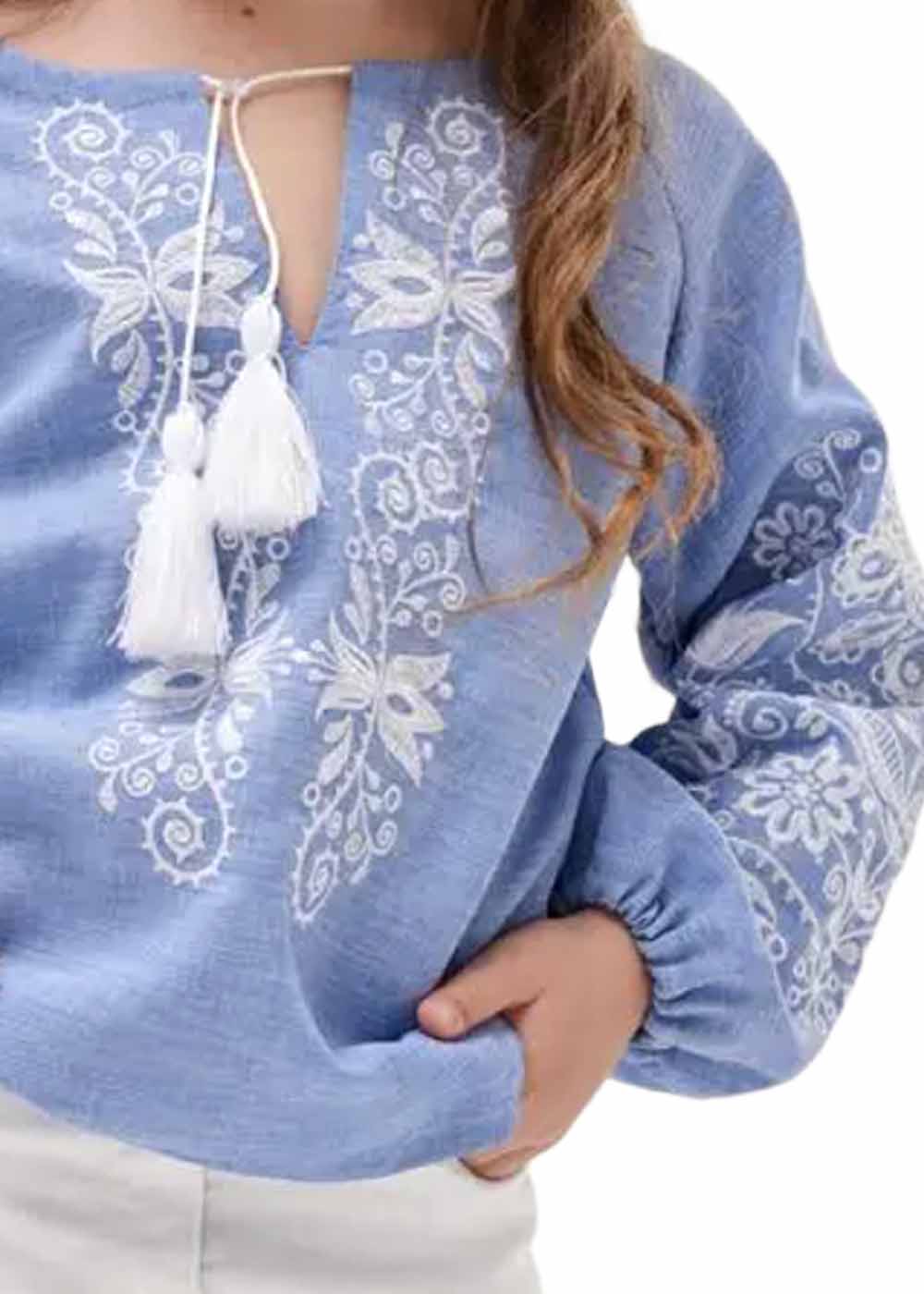 Дитяча вишиванка Орнамент продовжує тематику українського вишитого одягу. Вишиванка відмінно поєднується зі спідницею, джинсами та штанами.