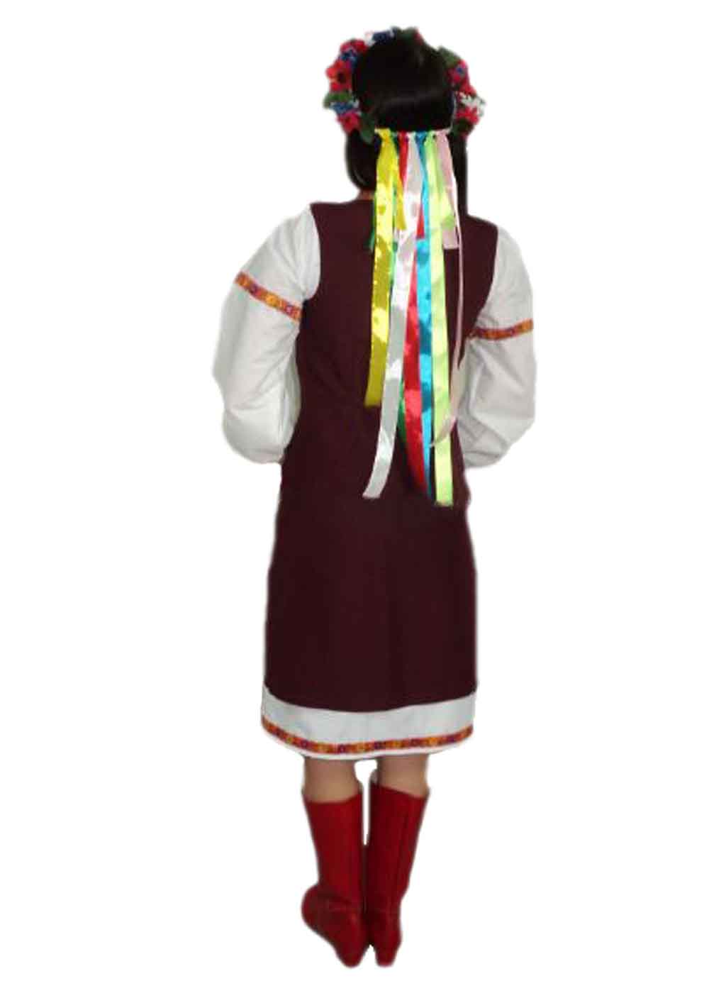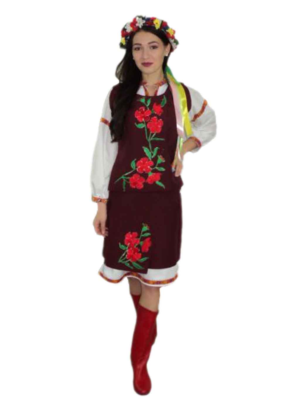 Украинский народный костюм бордового цвета выполнен из габардина и хлопка. В комплект входят рубашка, юбка и жилетка с аппликацией. Белая рубашка с длинными рукавами украшена вышивкой на манжетах и воротнике. Бордовая юбка и жилетка украшены яркими цветочными аппликациями, создавая традиционный и в то же время современный образ. Венок с цветами завершает костюм, придавая ему неповторимый украинский колорит.