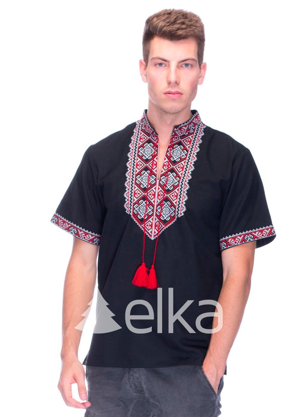 Вышиванка черная мужская с короткими рукавами выполнена из тканей высокого качества.