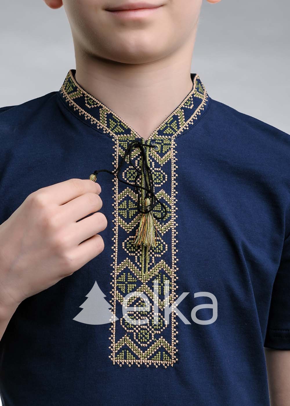 Вышиванка выполнена из хлопка и эластана. Натуральная ткань легко обволакивает тело, оставляя пространство для свободы движений. Уникальный орнамент находится спереди, там же расположились завязки с кисточками на конце. Данная модель станет незаменимой вещью в гардеробе мальчика.