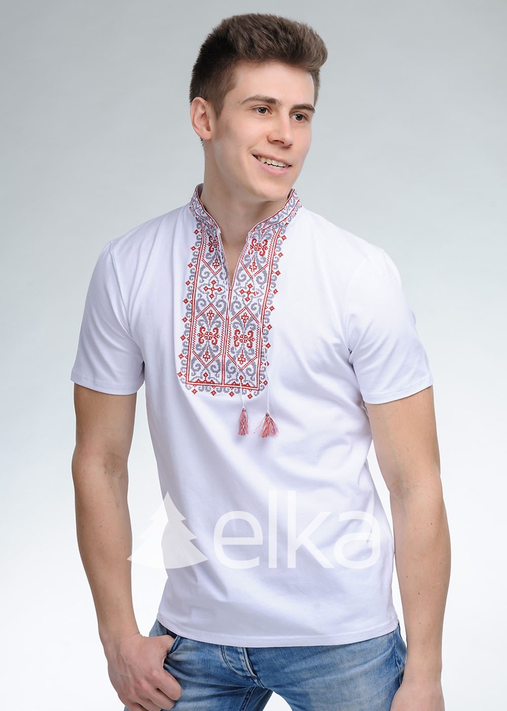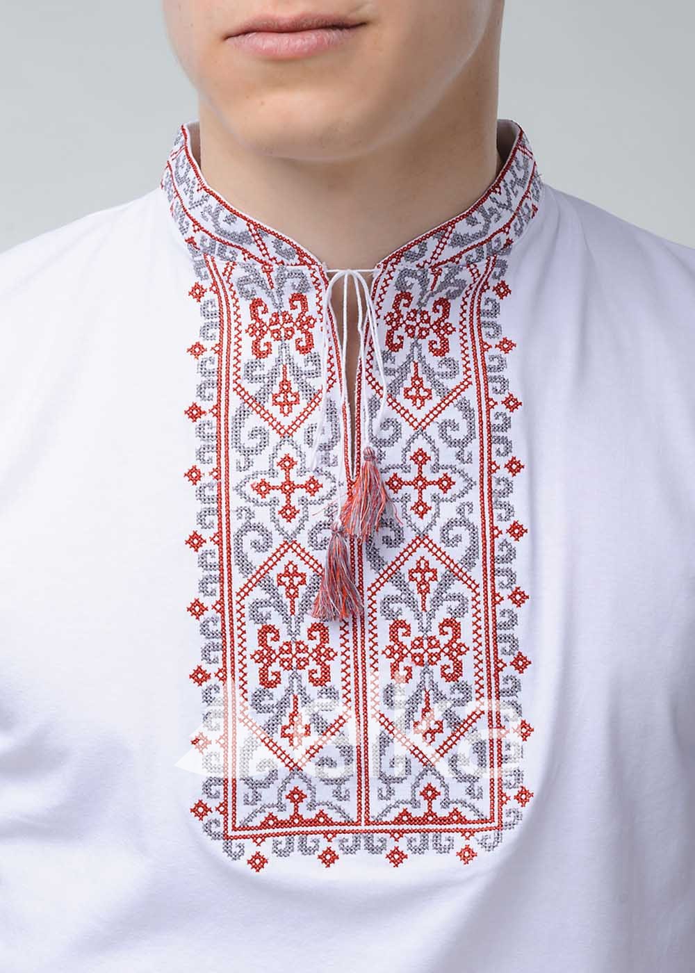 Основные ткани - хлопок и эластан. В комплектацию входит футболка. В центральной части присутствует традиционный украинский орнамент и геометрические элементы. Удобная застежка, завязки с кисточками и свободный крой делают вышиванку максимально комфортной в носке.