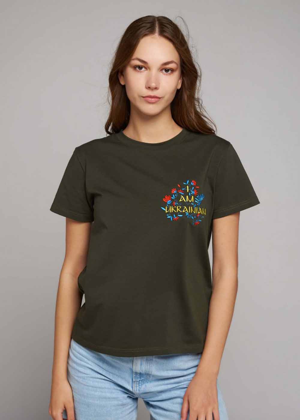Женская вышитая футболка I am Ukrainian представлена в темно-зеленом цвете и выполнена из высокого качества хлопка и лайкры. Предлагается в нескольких размерах: S-M, L-XL. Украшена спереди с левой стороны цветочной вышивкой и надписью Я Украинка!
