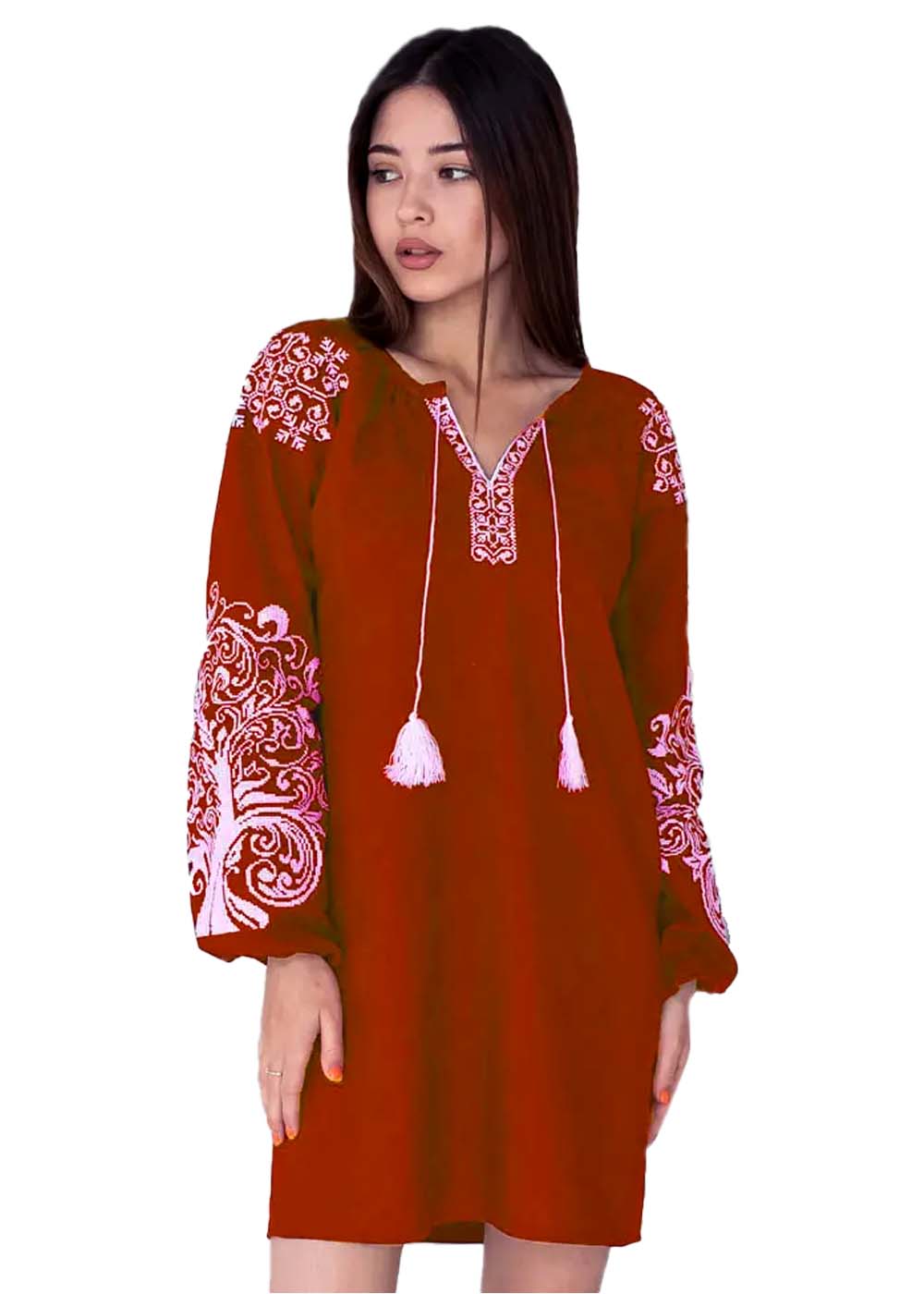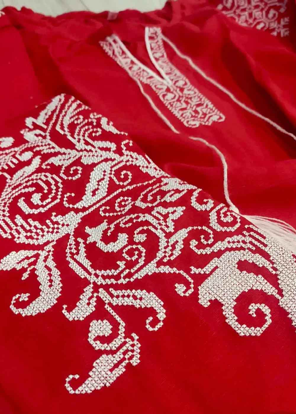 Вышитое платье Дерево жизни красное — яркое воплощение традиционной красоты и символики. Своим насыщенным красным цветом платье привлекает внимание, а белая вышивка спереди и на рукавах добавляет изысканный контраст. Белые завязочки придают платью завершенность и утонченность, создавая гармоничный и привлекательный образ. Наряд идеально подходит для тех, кто хочет подчеркнуть свою индивидуальность и насладиться стильным, элегантным дизайном.