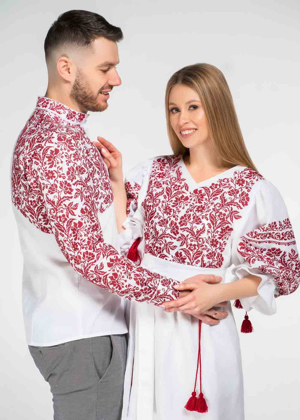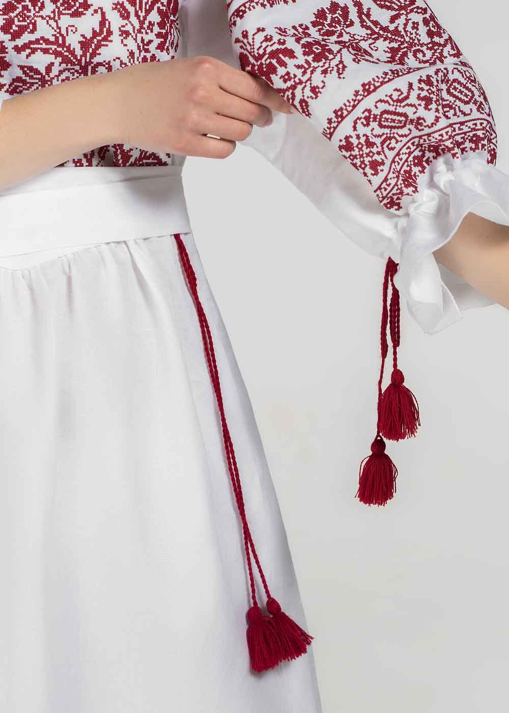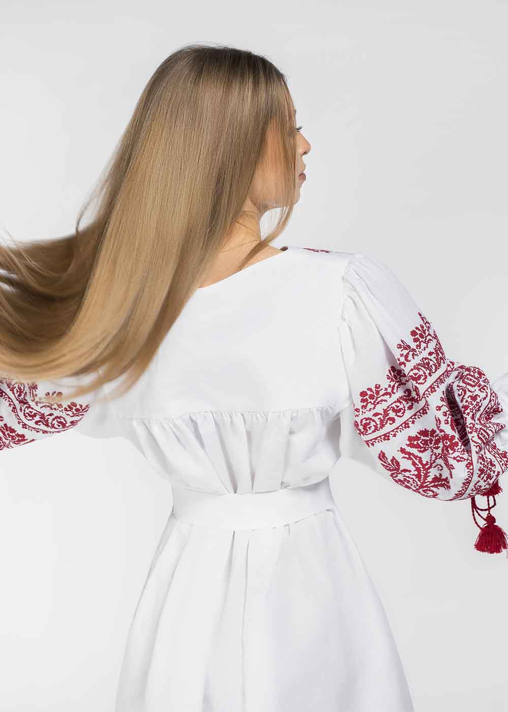 Вышитое платье Дивограй выполнено в белом цвете из натуральной льняной ткани высокого качества. Представлено в нескольких размерах. Платье вышиванка длины миди расклешенного кроя. Длина рукава ¾. Переднюю часть платья и рукава украшает вышивка отображающая старинные многовековые мотивы. Отдельным элементом декора являются контрастные красные кисточки. Пояс дополняет комплектацию.