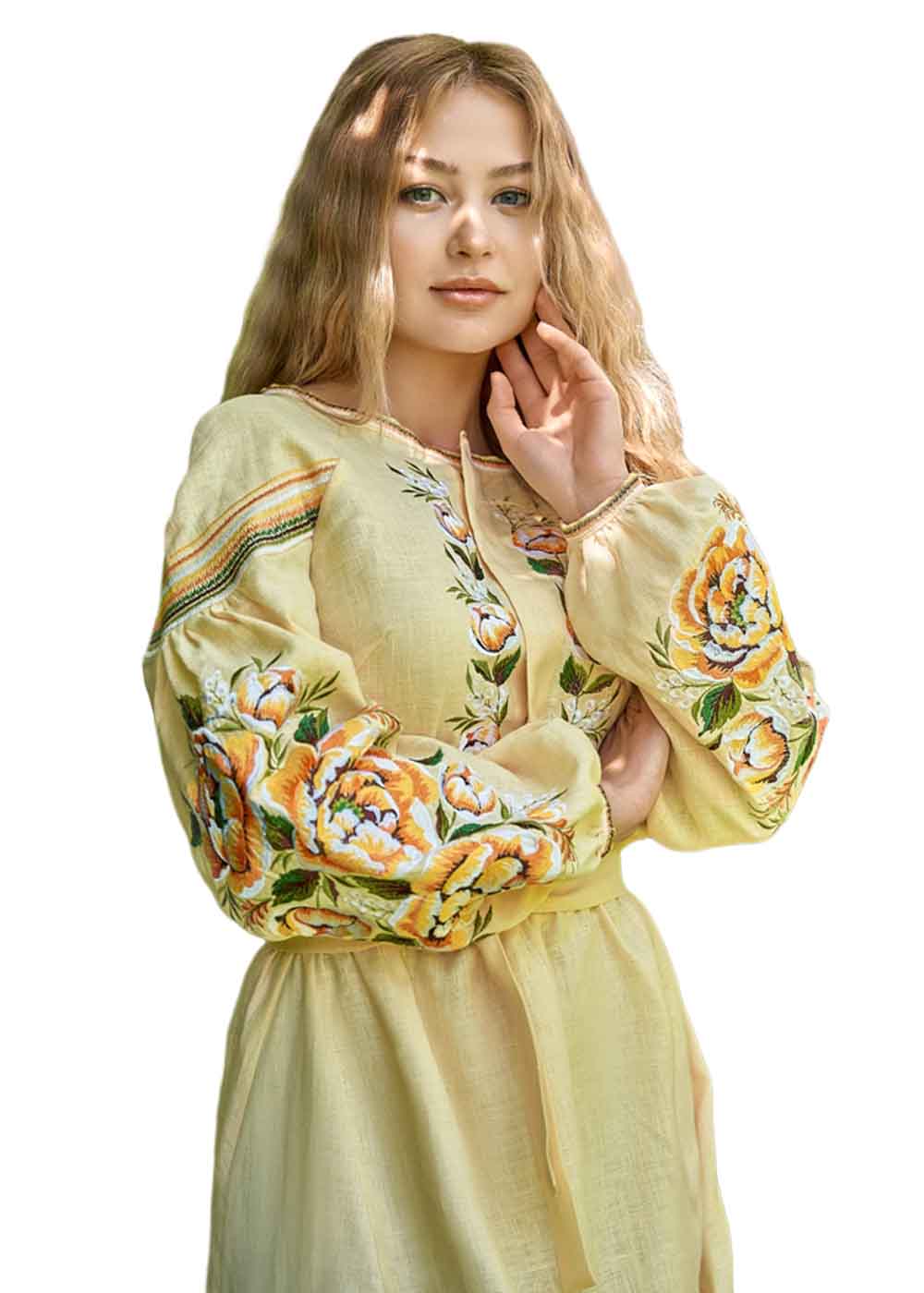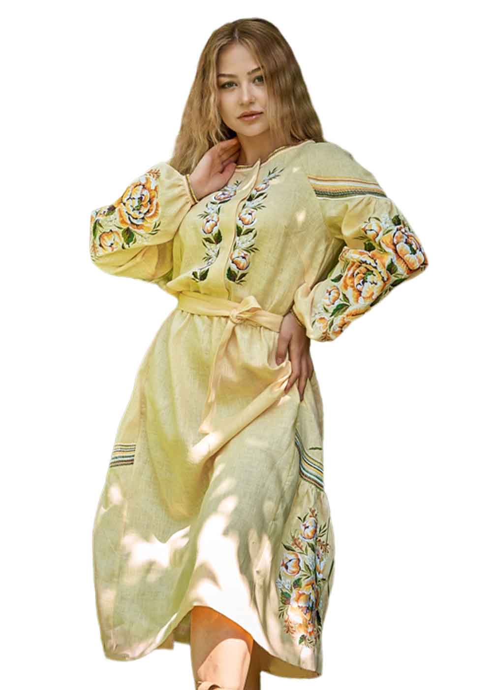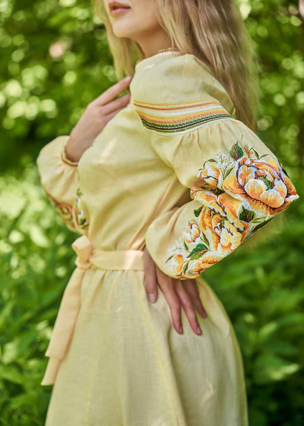 Вышитое платье миди жёлтое дополняет коллекцию вышитой одежды. Платье вышиванка выполнено из натуральной ткани - лён.
