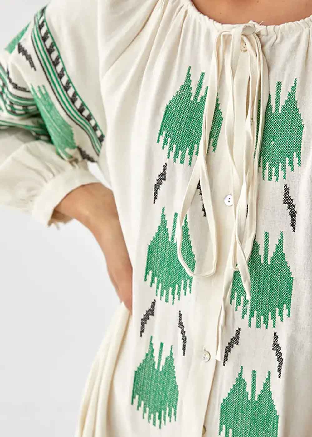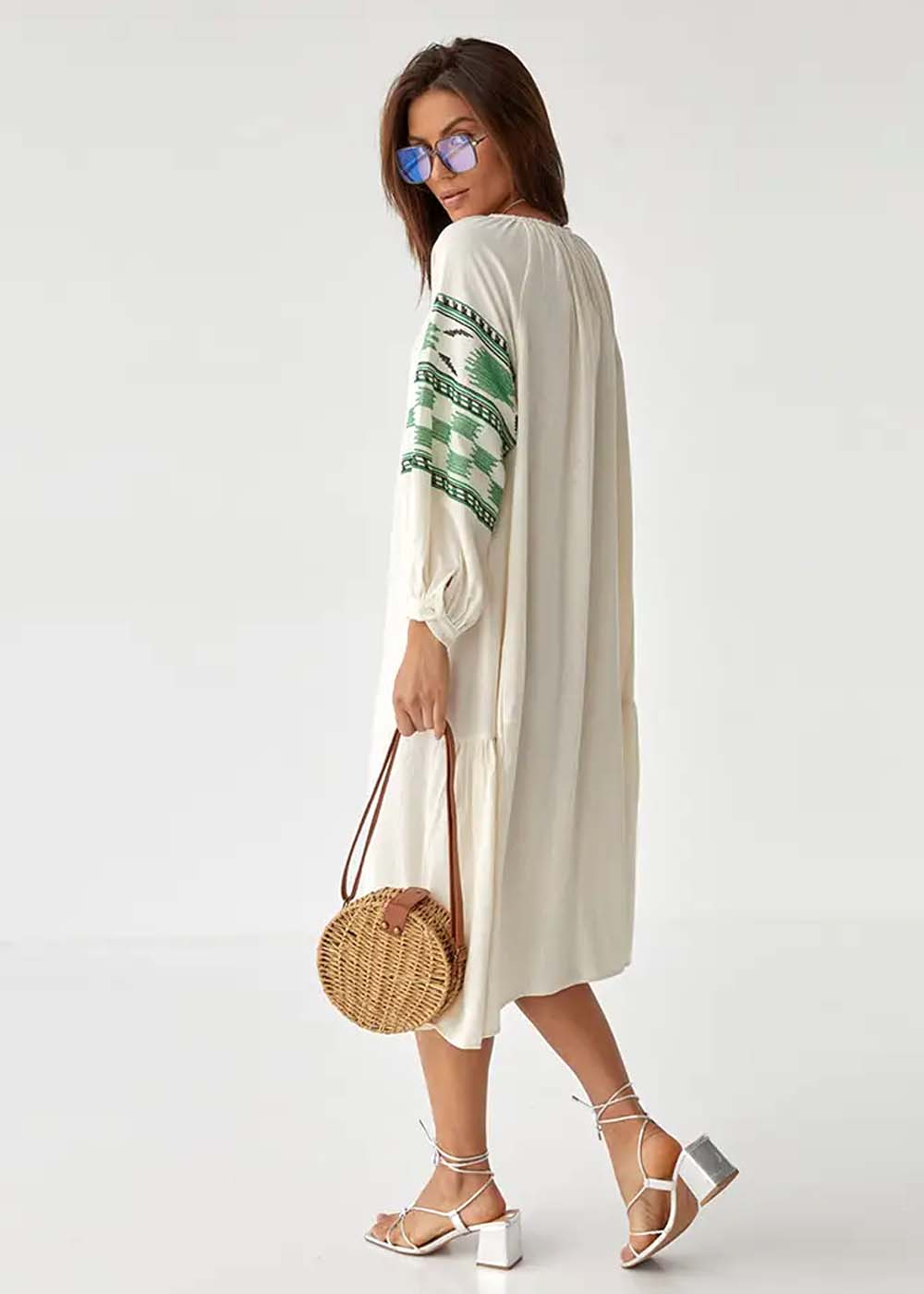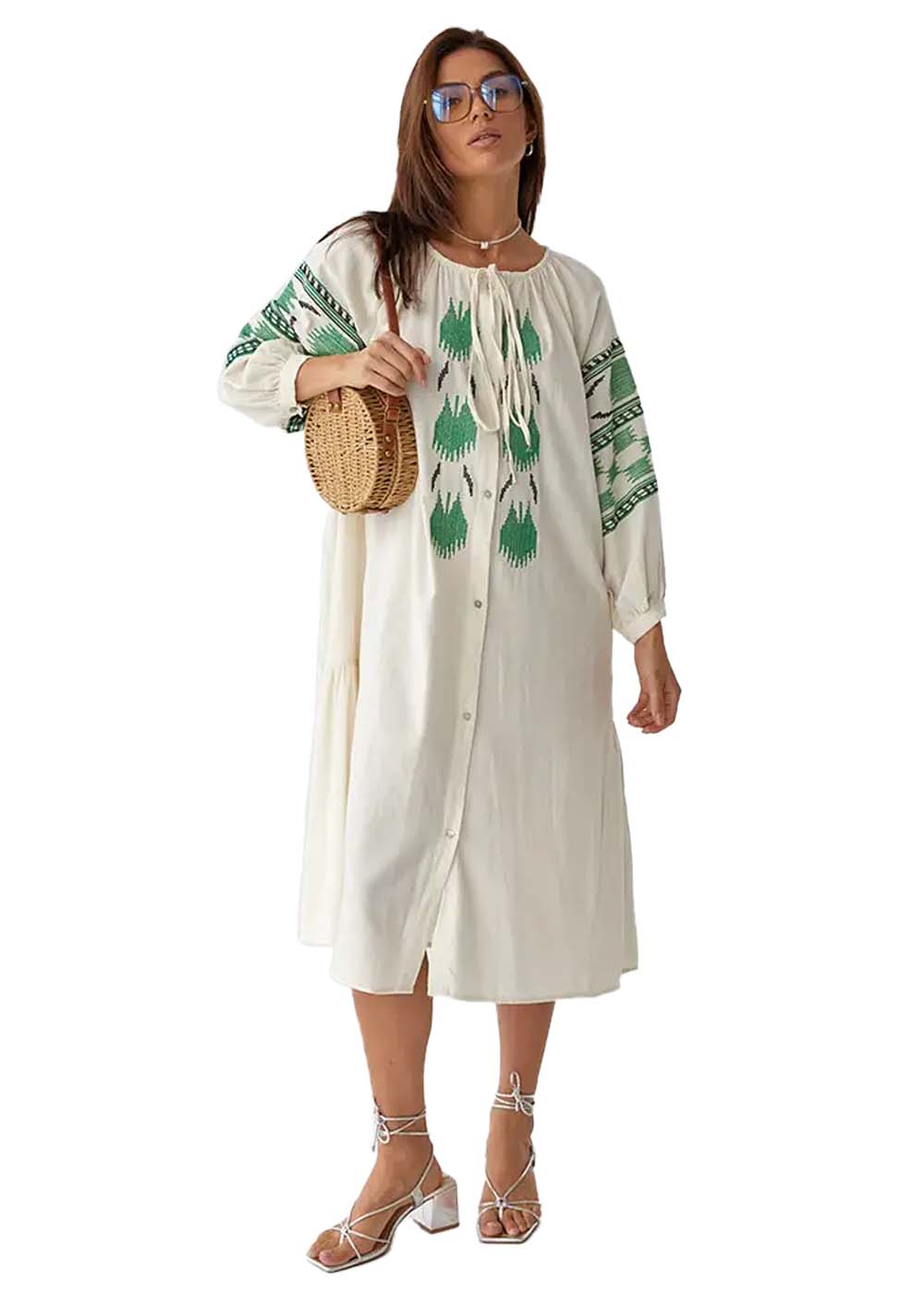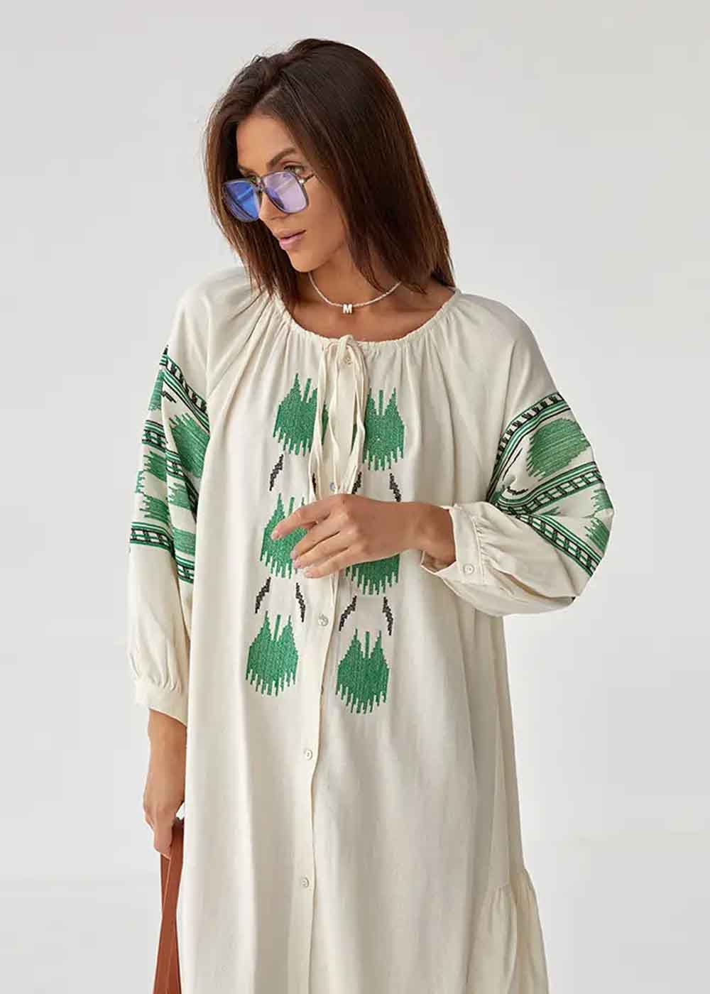 Вышитое платье Пава - воплощение элегантности и традиций. Платье на пуговицах украшено утонченной зеленой вышивкой, которая расположена спереди и на рукавах. Наряд не только подчеркивает вашу женственность, но и добавляет нотку изысканности и национального колорита в ваш образ.