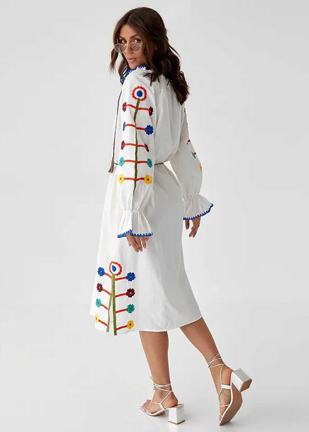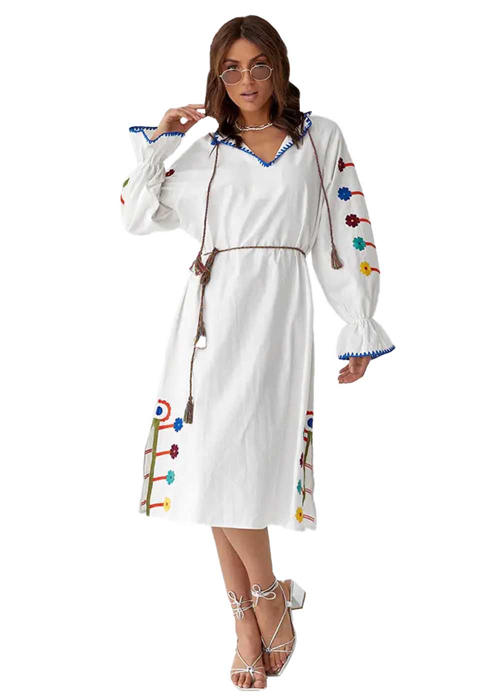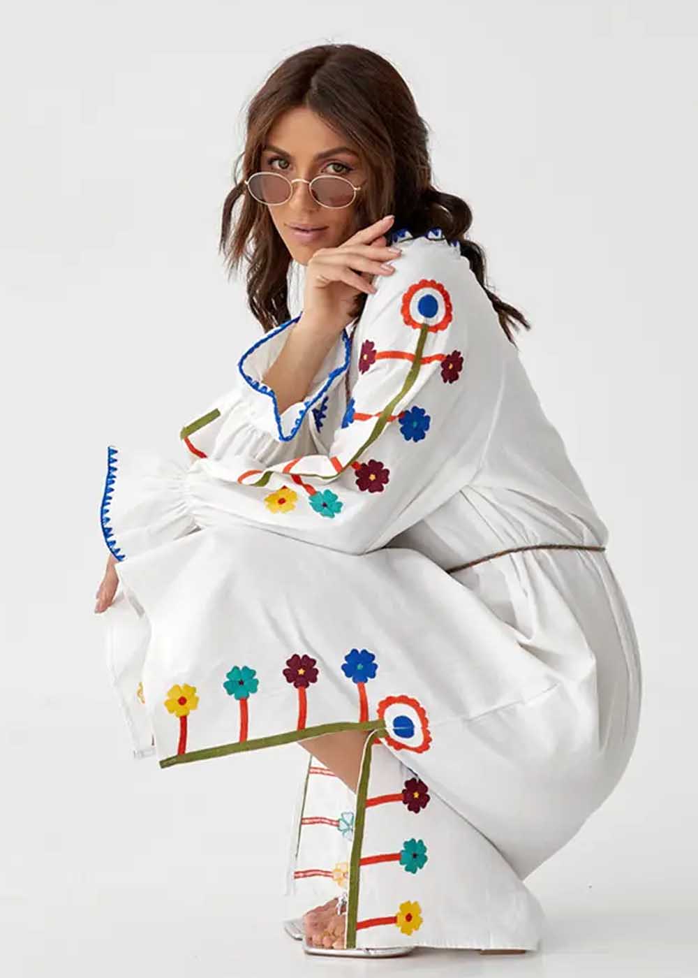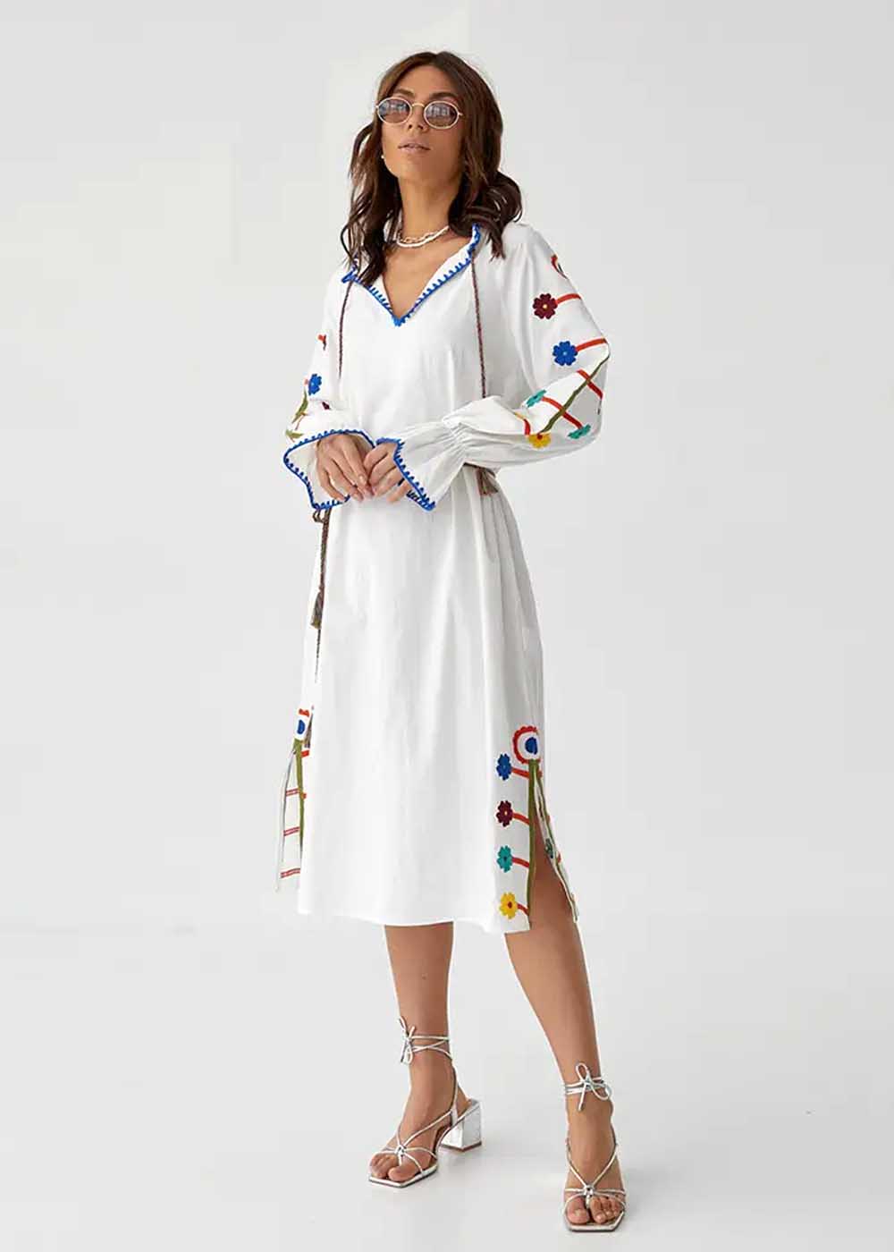 Вышитое платье Веснянка – белоснежное платье с изысканными разрезами внизу, украшенное орнаментами по бокам внизу и на рукавах. Детали придают платью уникальный шарм и подчеркивают утонченность.