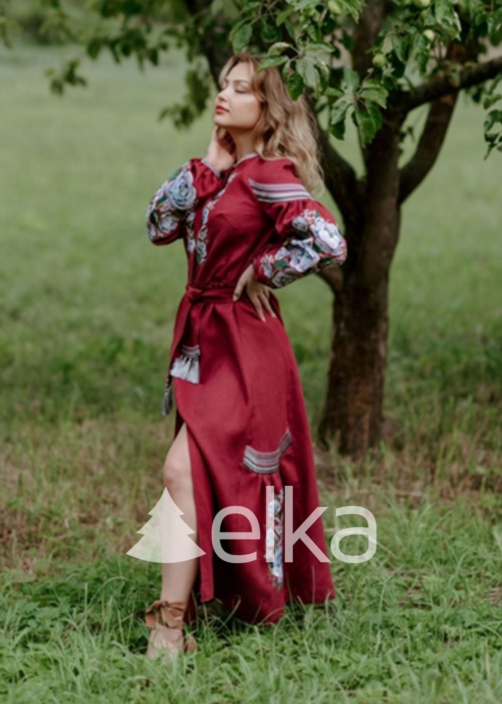 Вышитое платье насыщенного бордового цвета выполнено из 100%-го льна. Пышные рукава собраны широкими манжетами, разукрашены цветочным орнаментом. Узоры в виде нежных пионов нанесены также на подол длинного платья, на боковые вставки, плечи и зону декольте. Поясок с белыми кисточками подчеркнет талию, придавая образу больше женственности и нежности.
