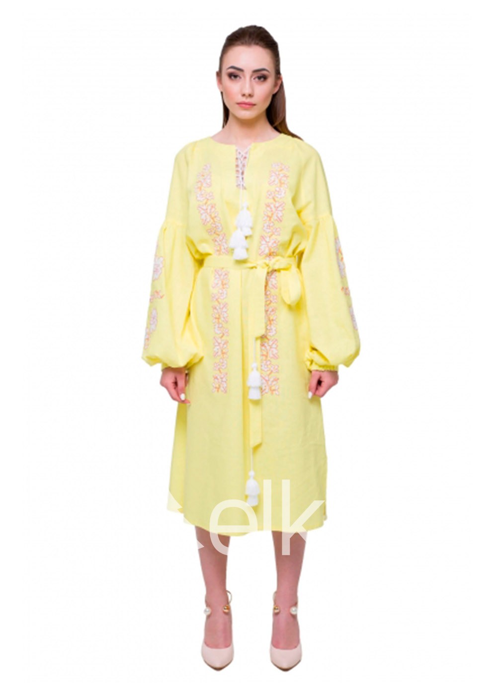 Эффектное и яркое платье желтого цвета из натуральных тканей. Весной и летом данная модель незаменима, ведь лен отлично пропускает воздух и позволяет беспрепятственно гулять даже в самую жаркую погоду. Платье укомплектовано широким поясом, который подчеркивает талию и придает образу женственности. Растительный орнамент означает внутреннюю силу и здоровье.