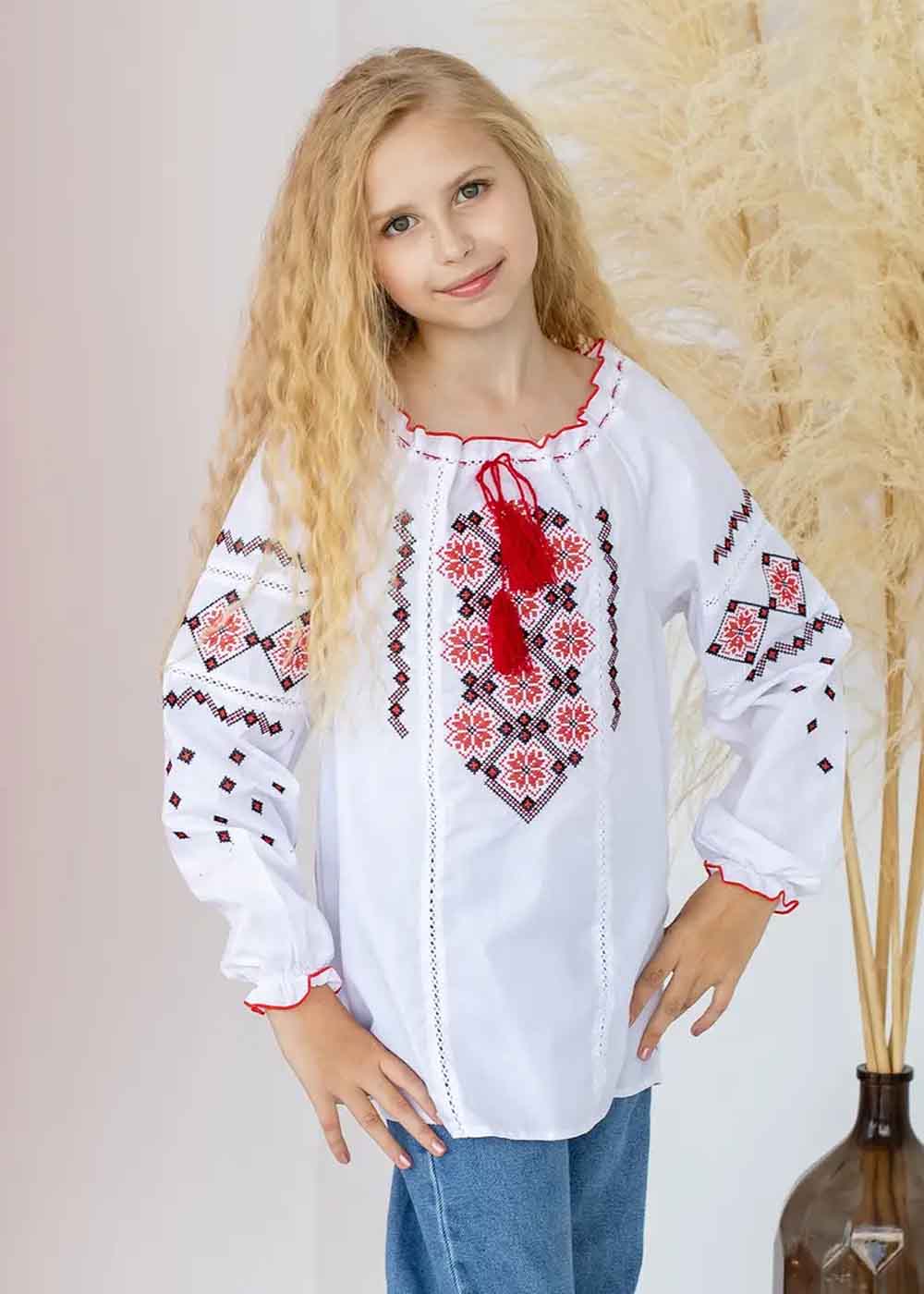 Вышиванка Марьяна для девочки — стильная белая вышиванка, декорированная изящной вышивкой. Элегантный дизайн дополнен двумя завязками спереди, которые не только придают стильный вид, но и обеспечивают идеальную посадку. Вышиванка станет замечательным выбором для праздников и особых случаев, подчеркивая индивидуальность и связь с традициями.