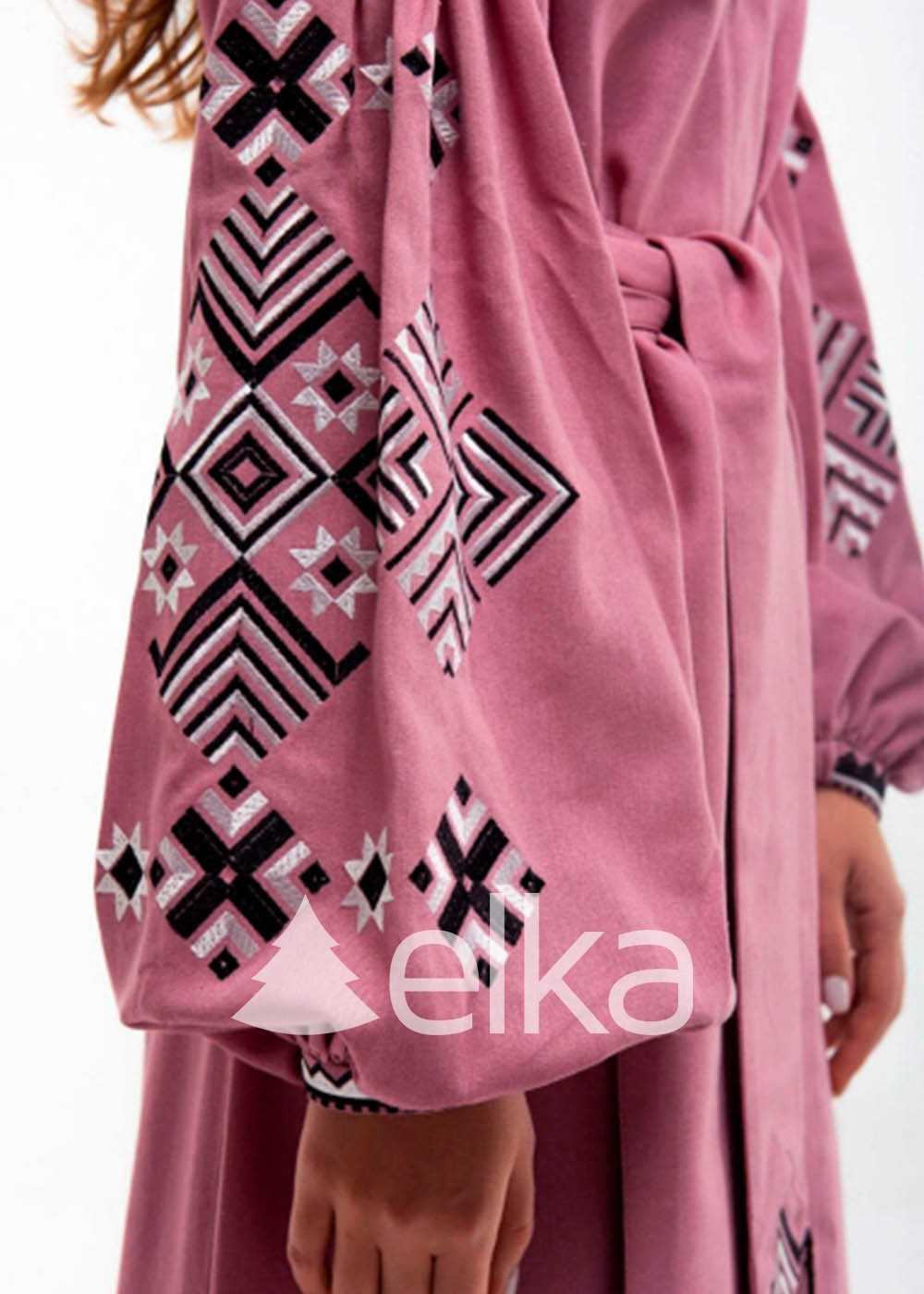 Эффектное платье вышиванка в цвете "пудра". Нежный оттенок ткани в симбиозе с черно-белой вышивкой образует самобытное слияние красок. Пышные рукава вышитого платья подчеркивают хрупкость женских рук, а манжеты на резинках позволяют свободно двигаться. Ромбы символизируют, в первую очередь, плодородие, а также гармонию женского и мужского начал. В давние времена одежду с ромбической вышивкой рассматривали как сильный оберег от невзгод.
