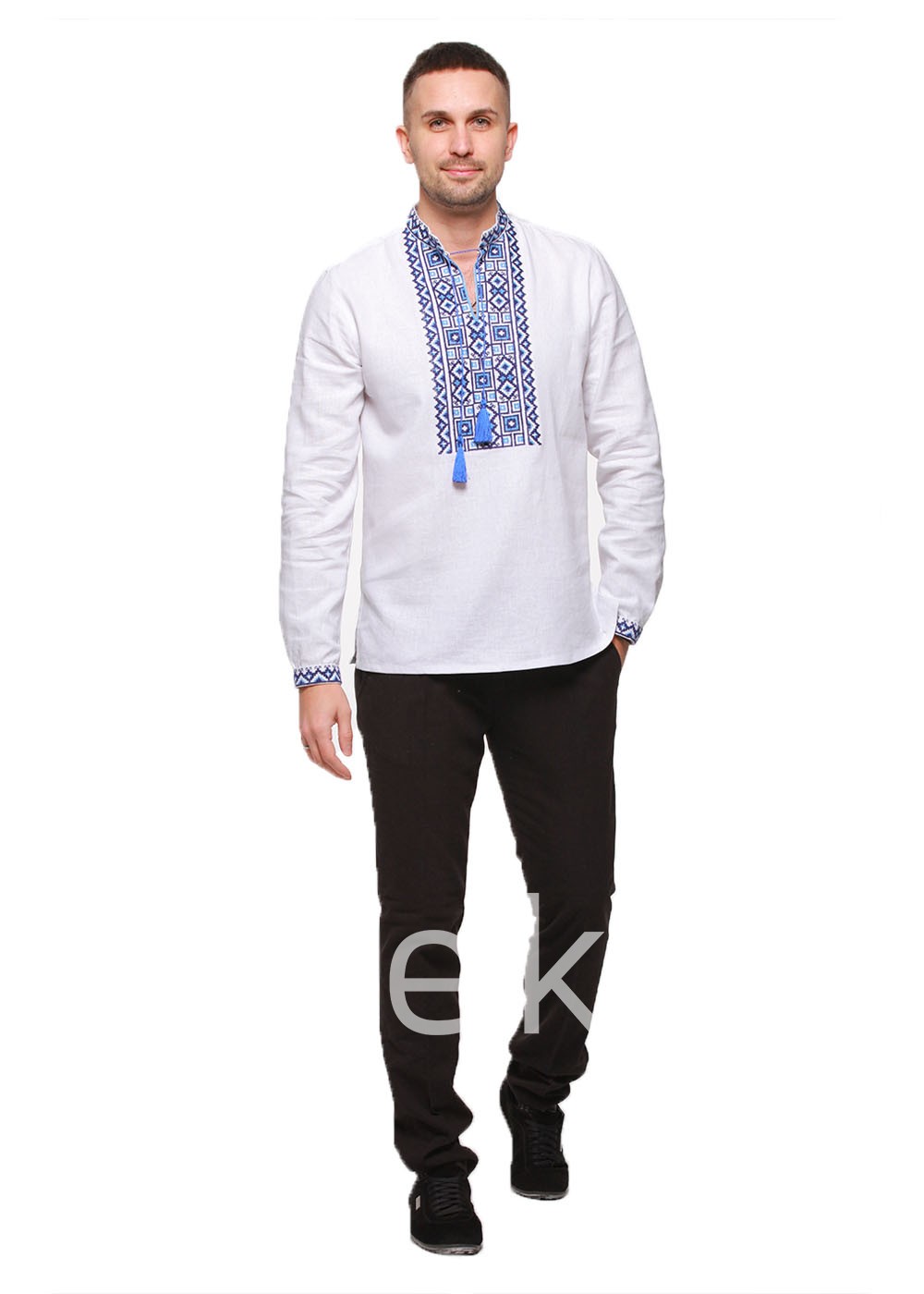 Вышиванка из льна со старинными орнаментами Восточного Подолья. Рубашка украшена аутентичной вышивкой в синих оттенках. Она символизирует энергию неба и воды. Льняная рубашка имеет классический дизайн, для которого характерны узоры на вороте, груди и манжетах рукавов. Геометрические узоры несут в себе силу духовного начала, плодородие и материальное благополучие. Свободный крой данной модели совершенно не сковывает движения и позволяет чувствовать себя комфортно.