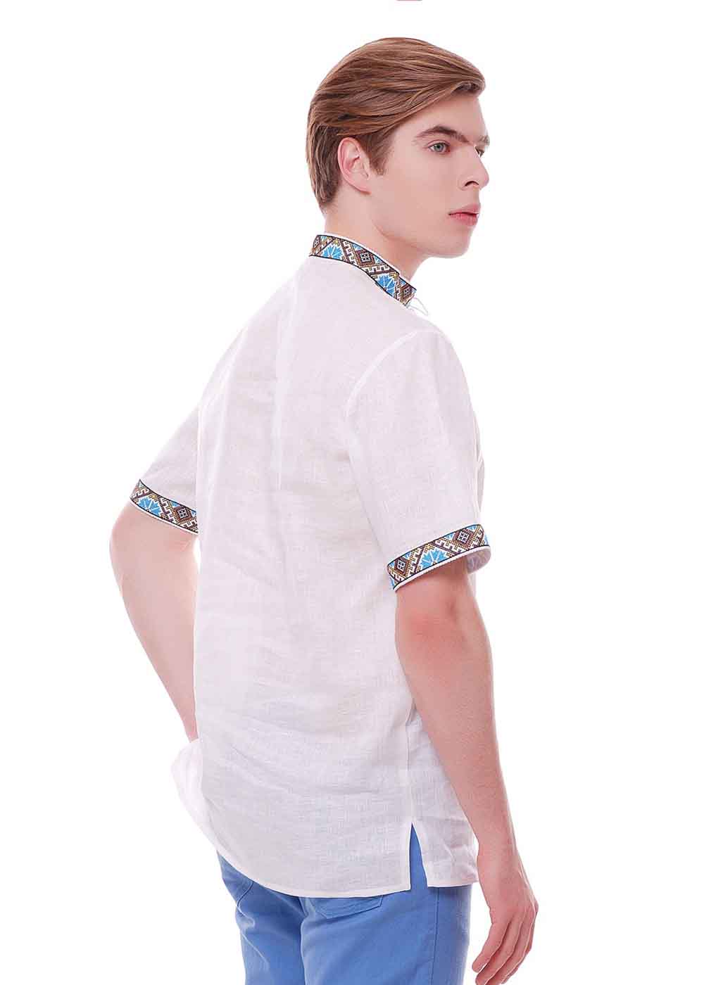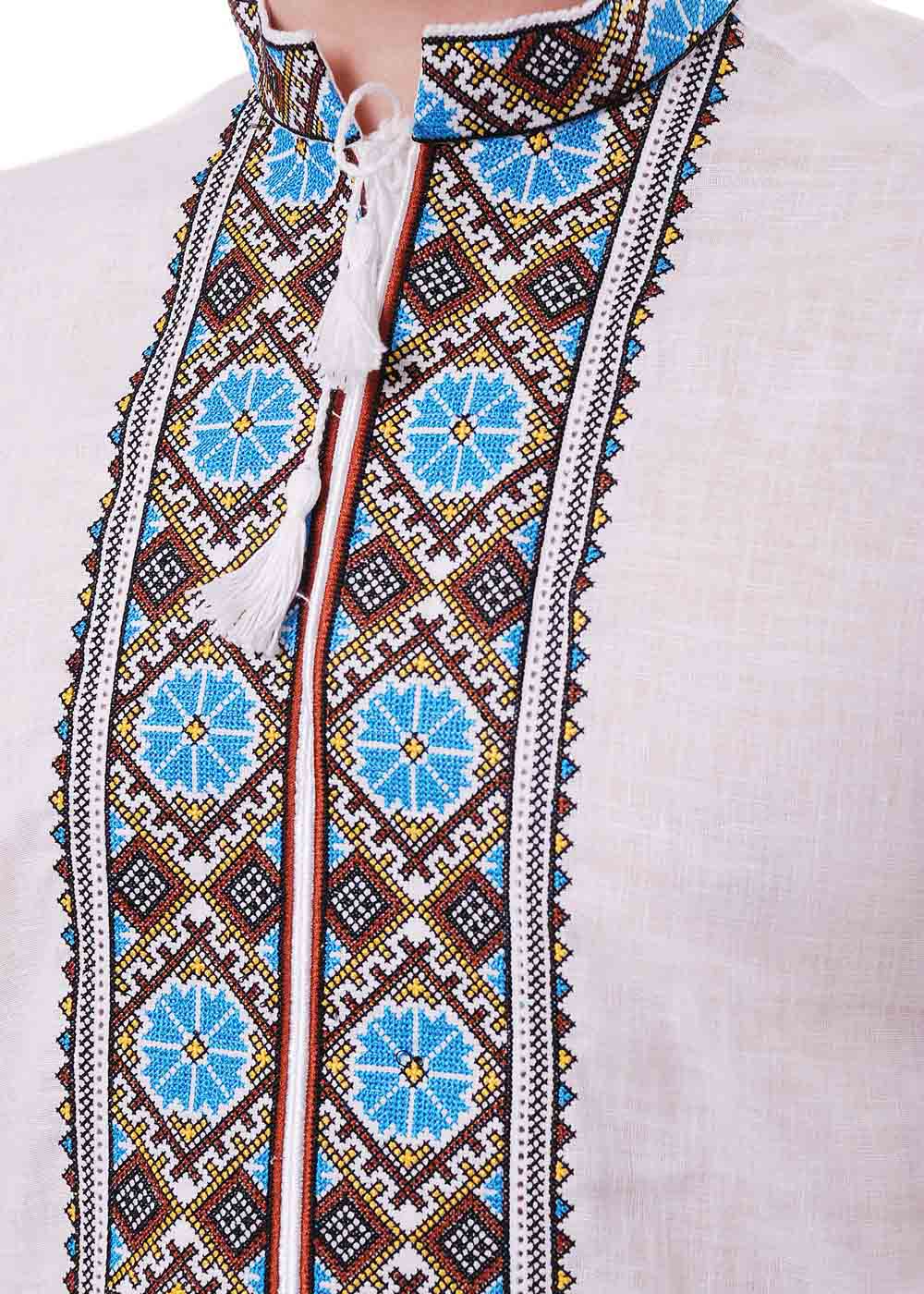 Вышиванка Васильки, выполнена в белом цвете из натурального 100% Льна, что обеспечивает комфортное и долгосрочное ношение. Декорирована национальными узорами на воротнике, рукавах и передней части рубашки.
