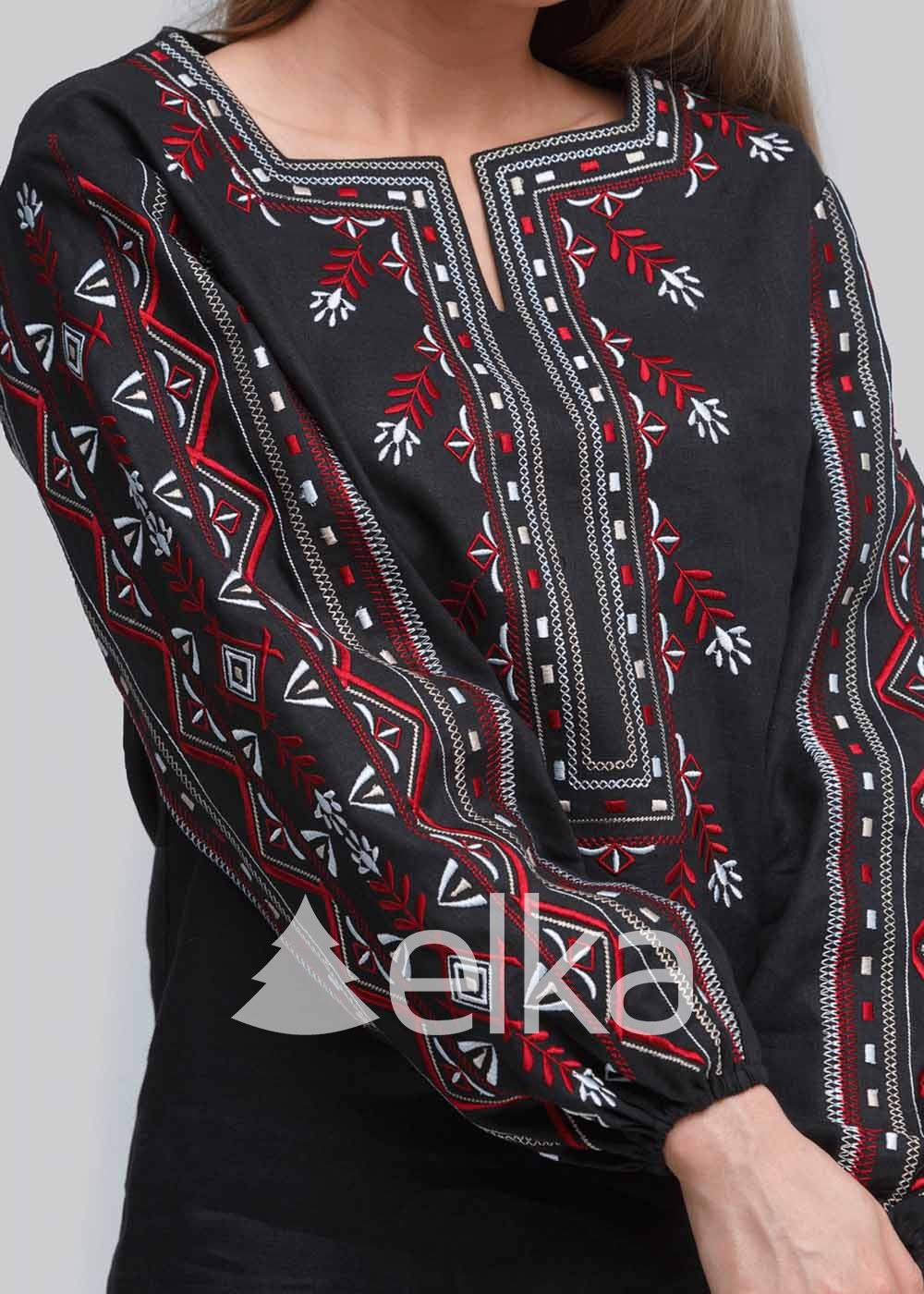 В вышиванке сочетаются оттенки благополучия, любви и чистоты - черный, красный и белый. Суженый рукав к запястью изящно подчеркивает женственность и хрупкость образа. Вышивка на сорочке символизирует доброту, радость, любовь, чистоту и верность. Прекрасное сочетание цветовой гаммы, расположения орнамента, комфорт и качество, подчеркивают изысканный вкус ее обладательницы.
