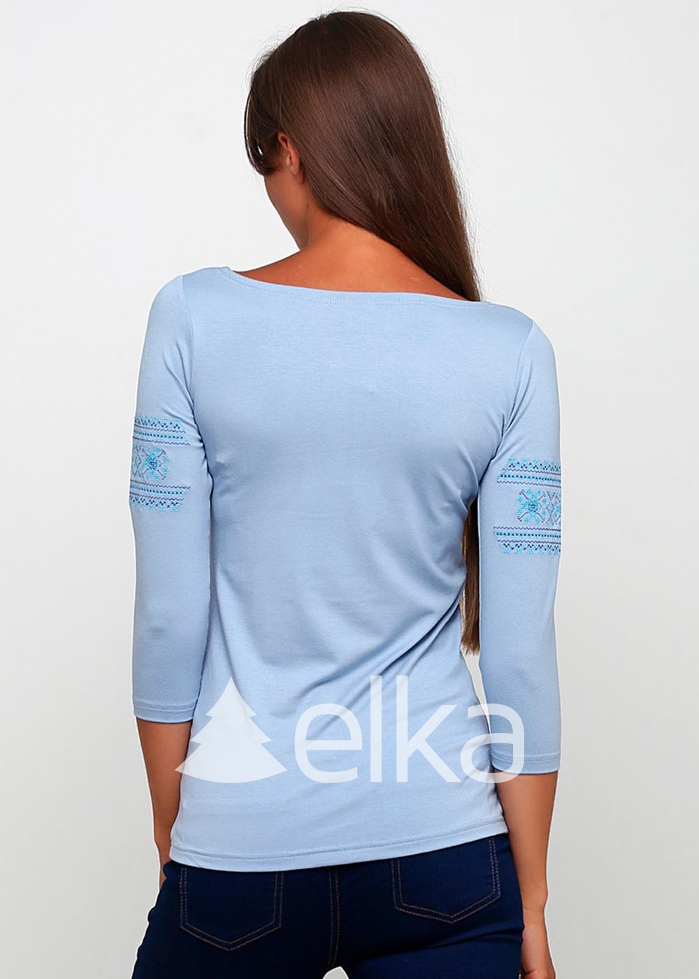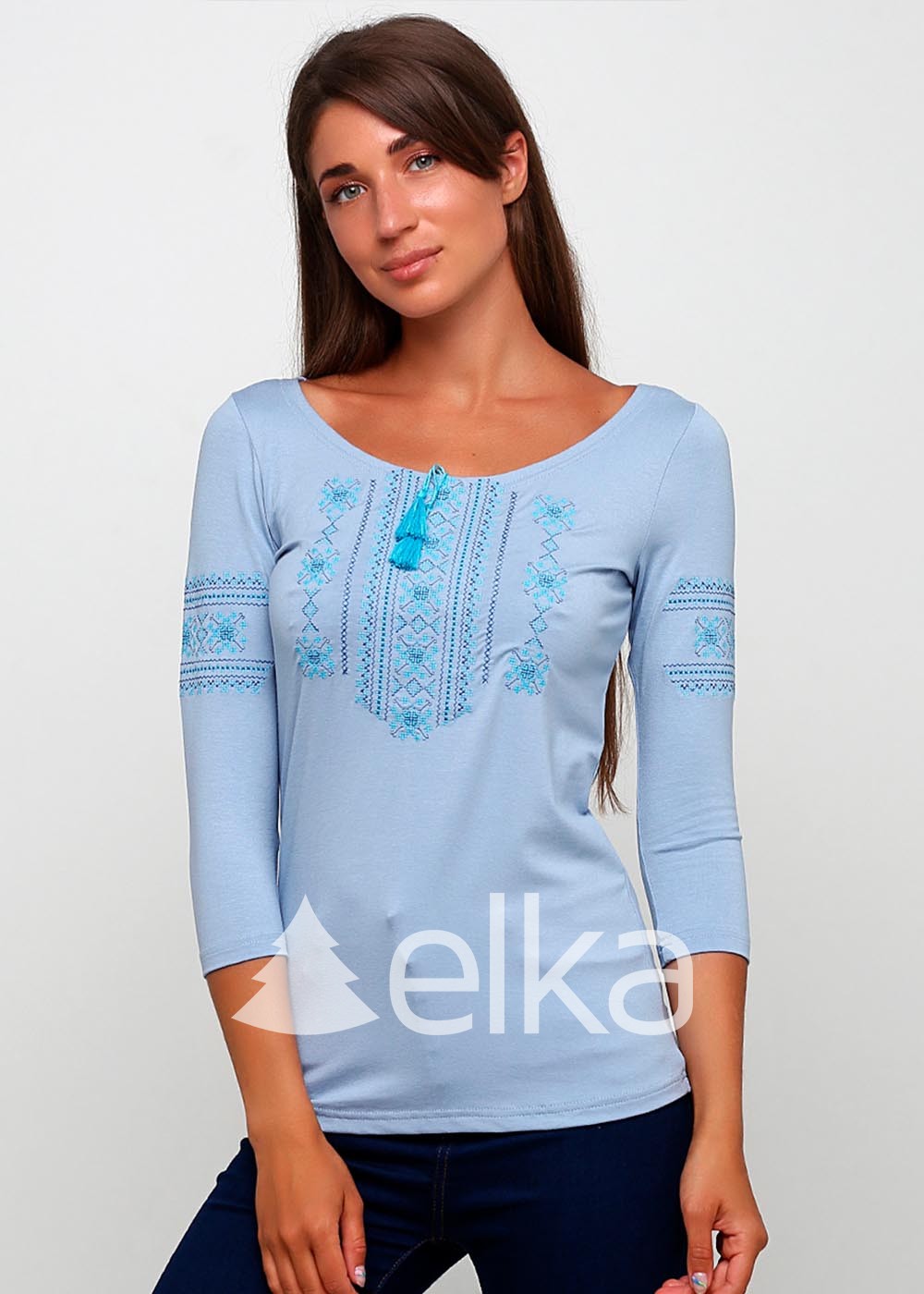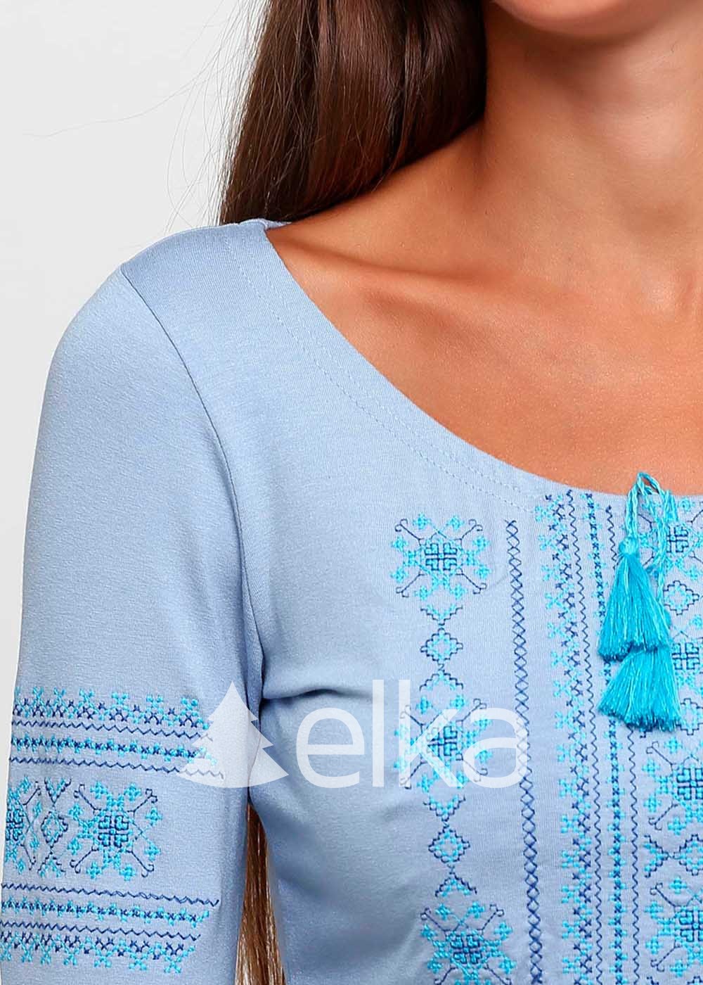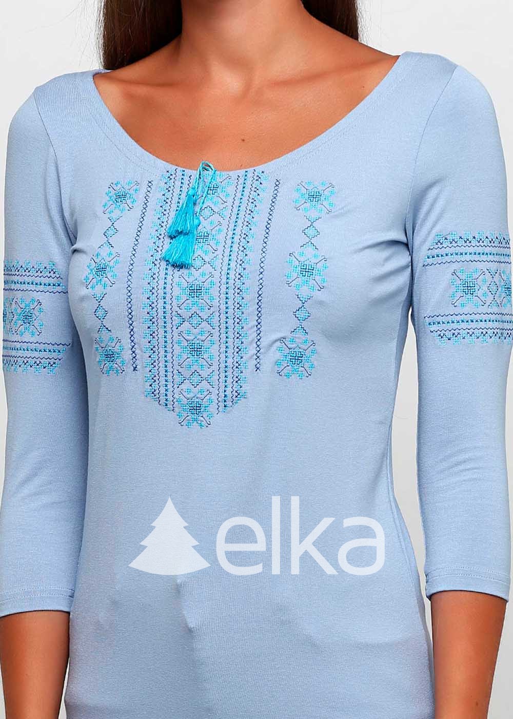 Футболка женская с голубой вышивкой выполнена из высококачественной ткани.