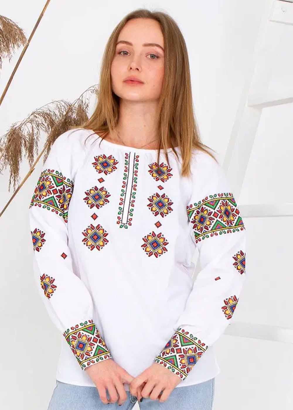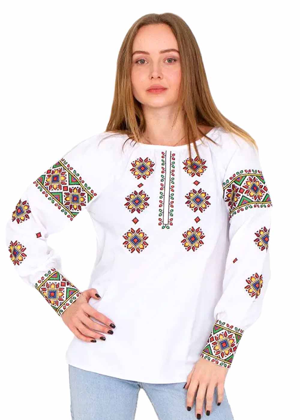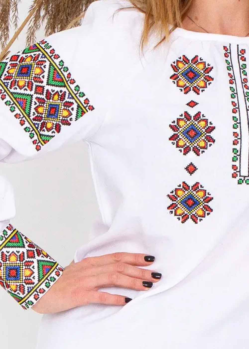 Вышиванка женская Оксанка - воплощение утонченной женственности и традиционного стиля. Белая ткань излучает чистоту и элегантность, а изысканная вышивка, покрывающая переднюю часть и рукава, добавляет яркие акценты. Изящный элемент декора делает изделие идеальным для особых случаев, сочетая комфорт и классическую красоту.