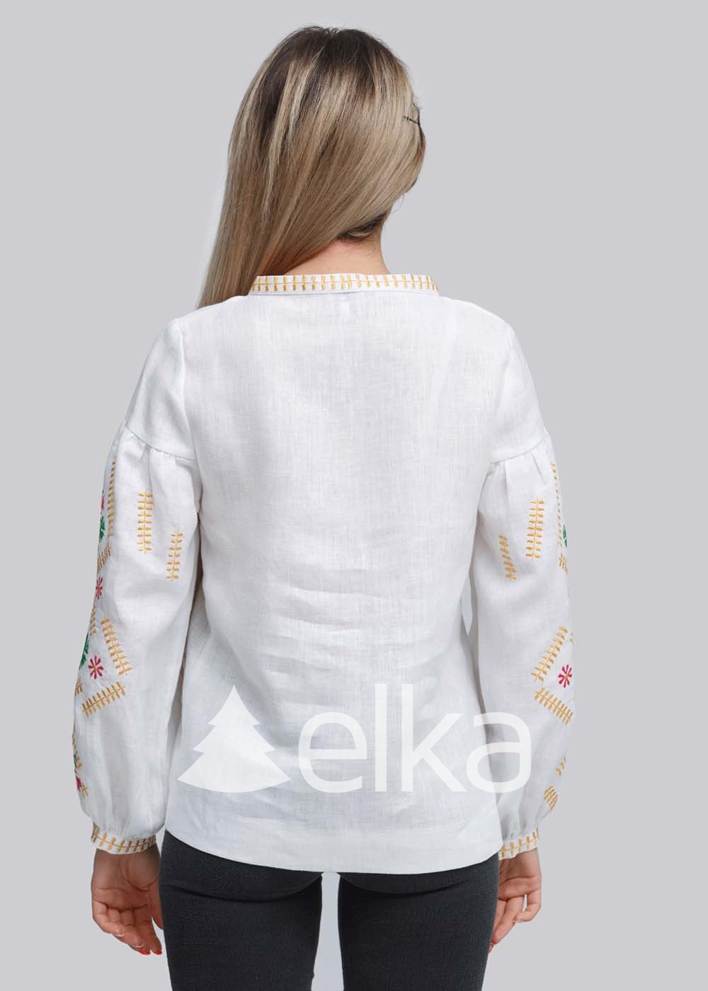 В вышивке сочетаются оттенки розового, желтого и зеленого. Особенность данной модели в ее оригинальной славянской вышивке. Переплетение линий символизирует землю, воду, огонь и солнце. Орнаменты на пышном рукаве вышиты в технике "гладь". Суженый рукав к запястью подчеркивает женственность и хрупкость образа. Надев данную вышитую рубашку Вы не останетесь без внимания и комплиментов.